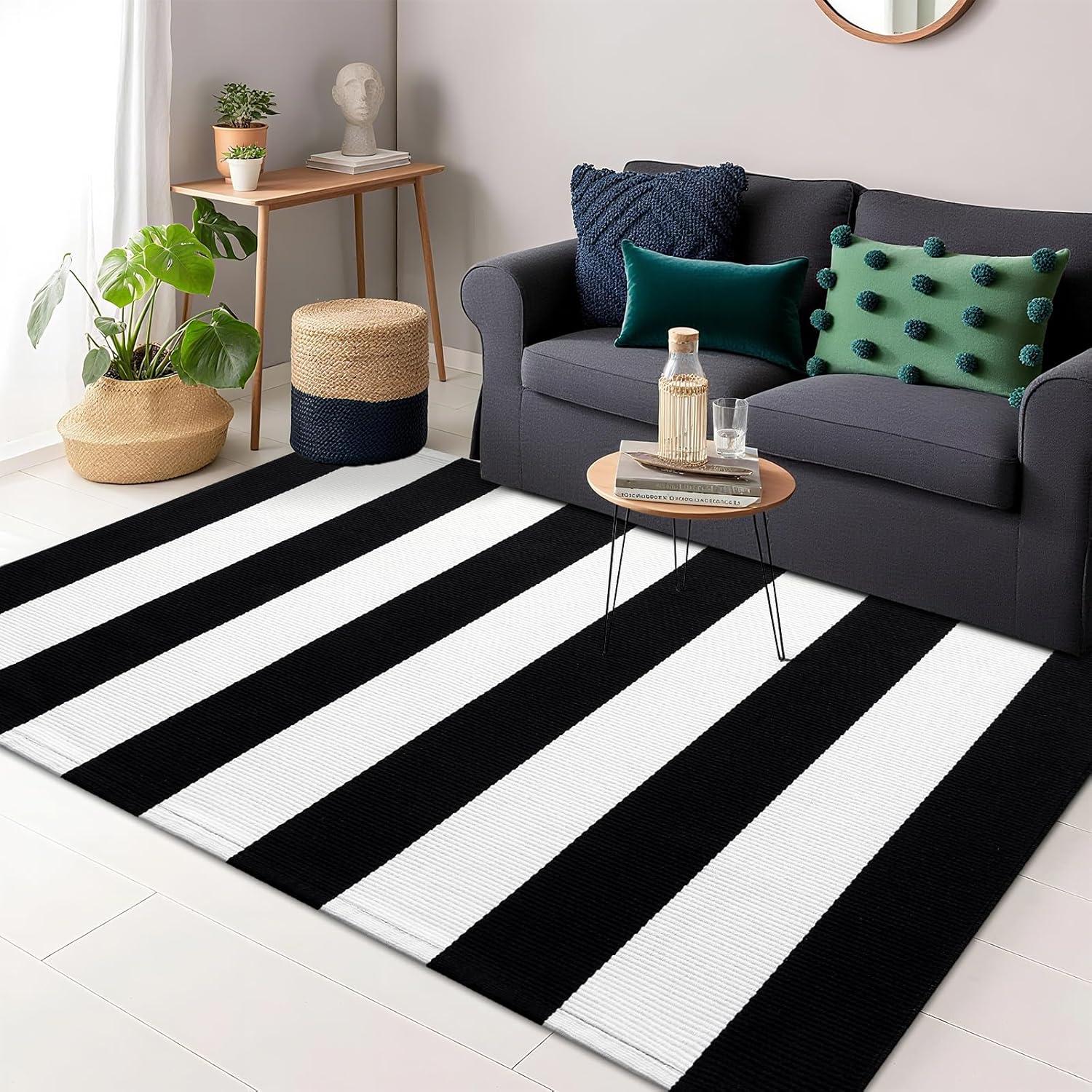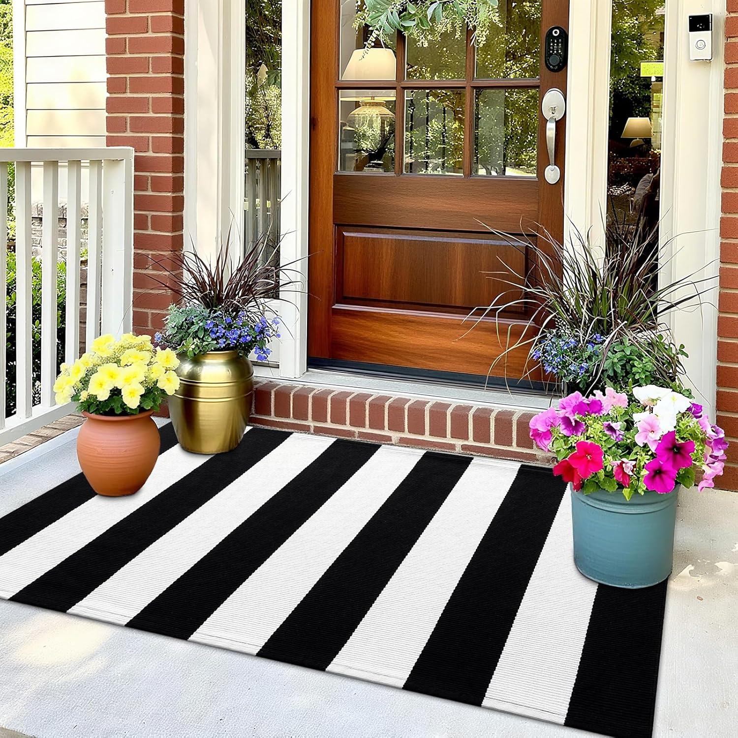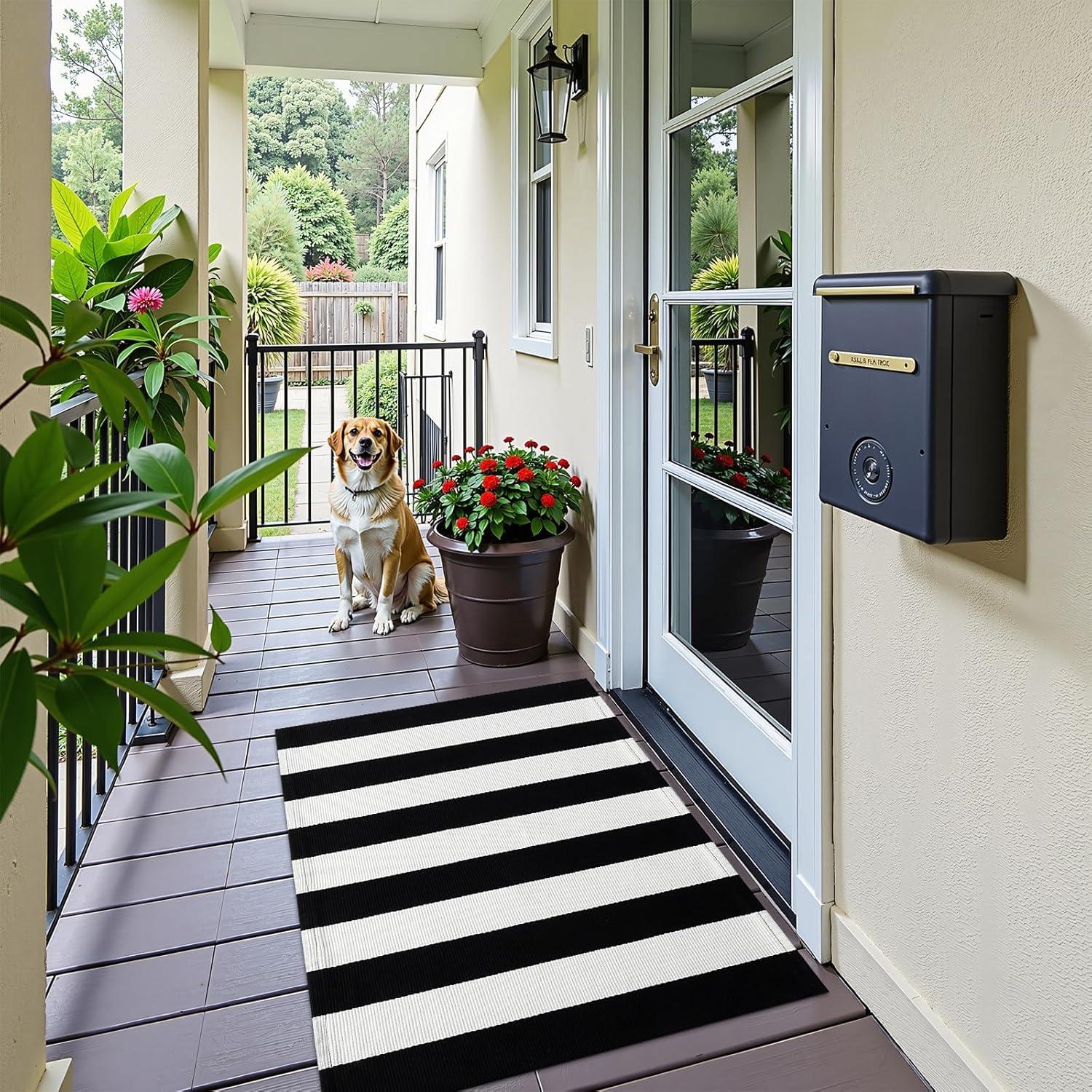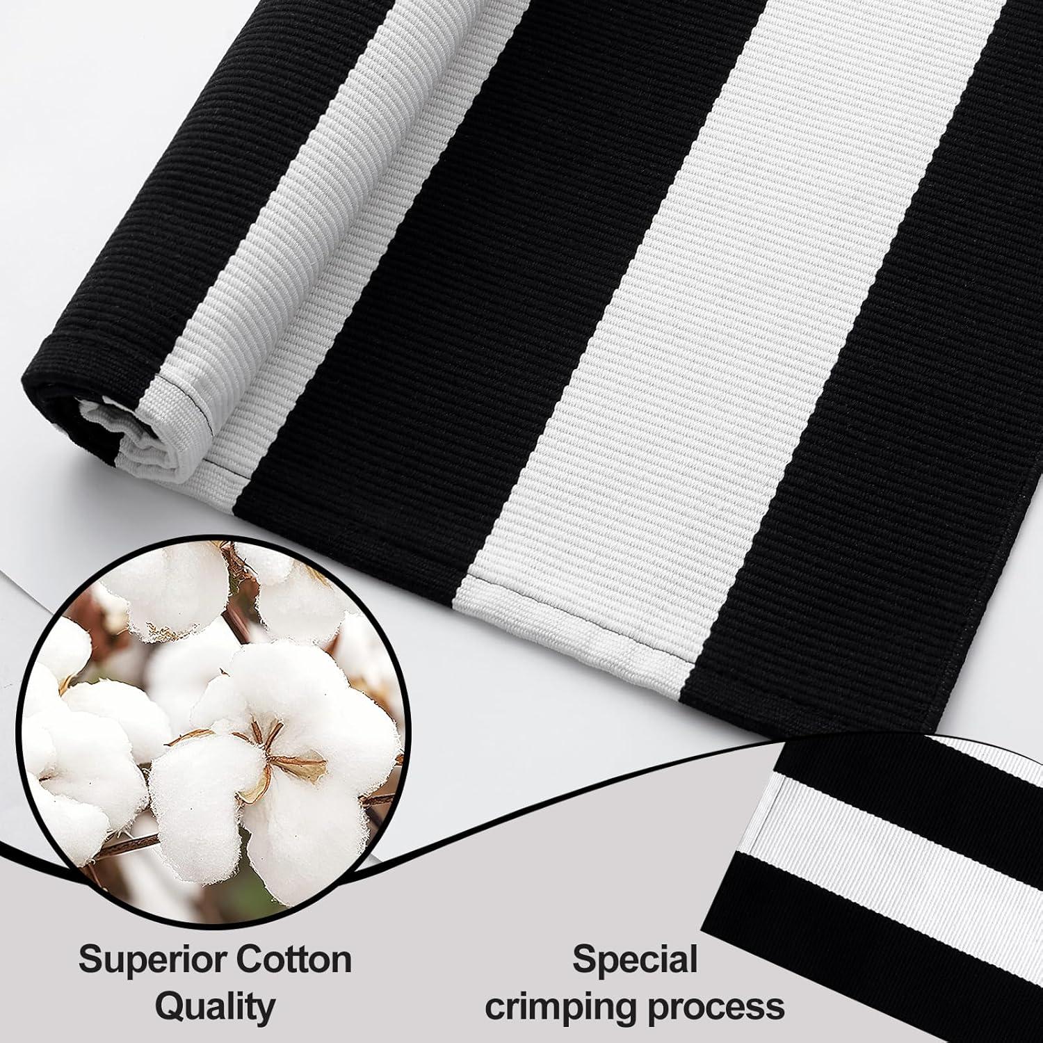 [Hardwearing Cotton Blend Fabric] This black and white striped rug is handwoven from a thick cotton-polyester blend with a dense low pile, making it a durable farmhouse rug that absorbs well, breathes easily, and resists loosening or fading. Perfect for long-lasting style and comfort in your entryway rug, front porch rug, or living room accent mat.