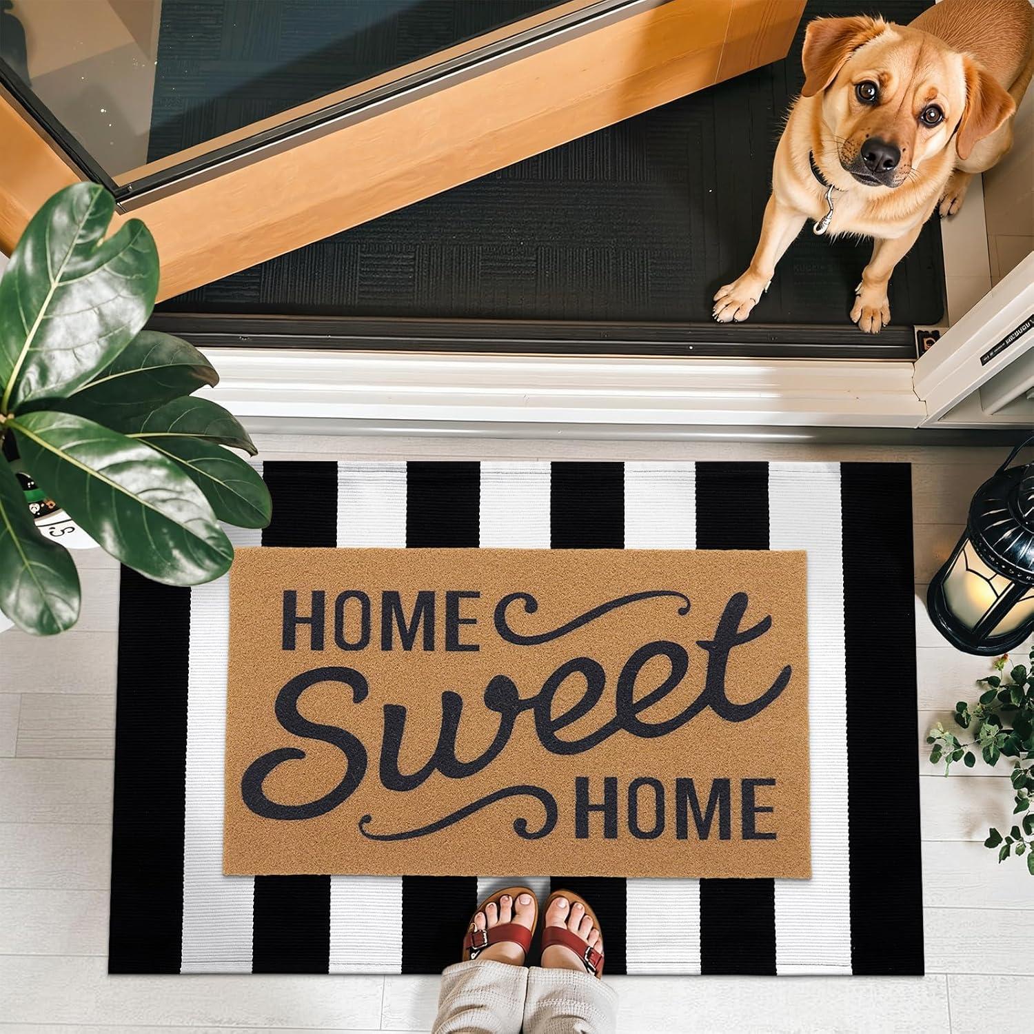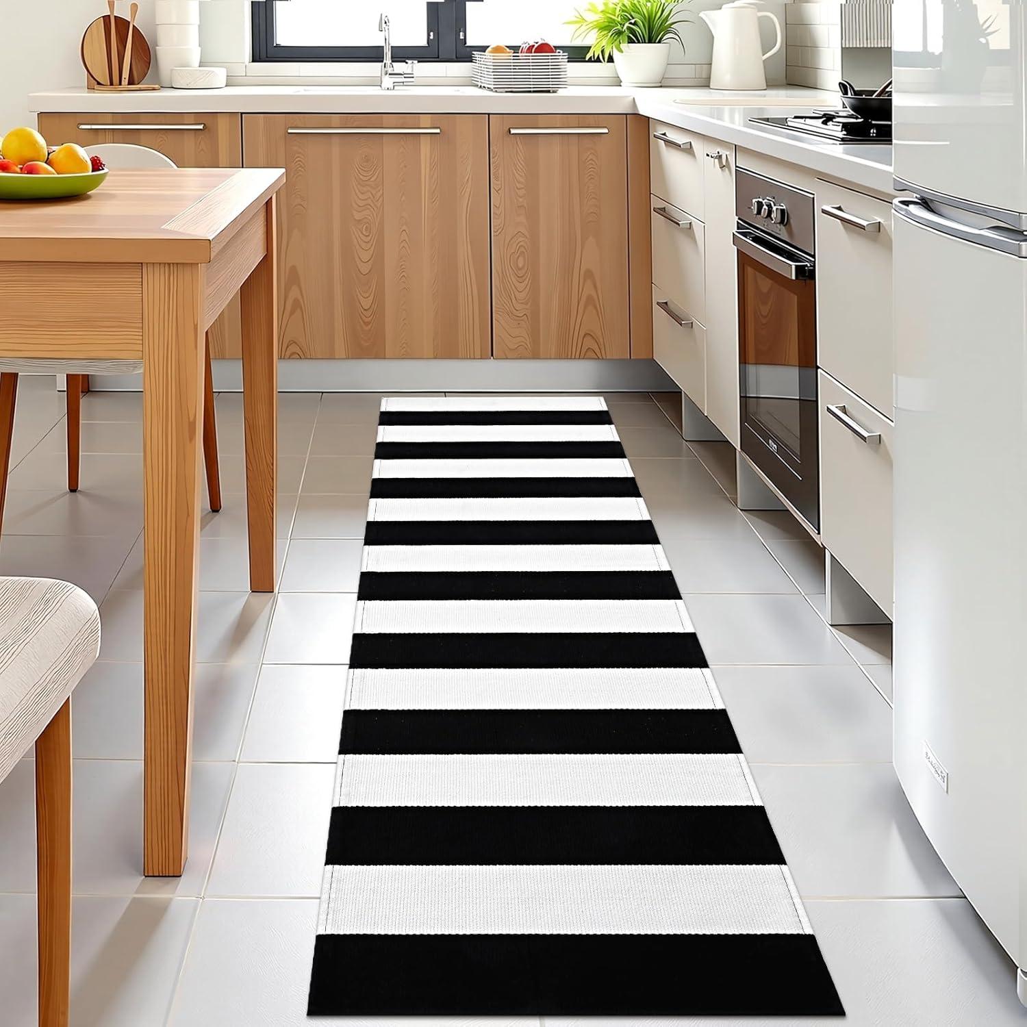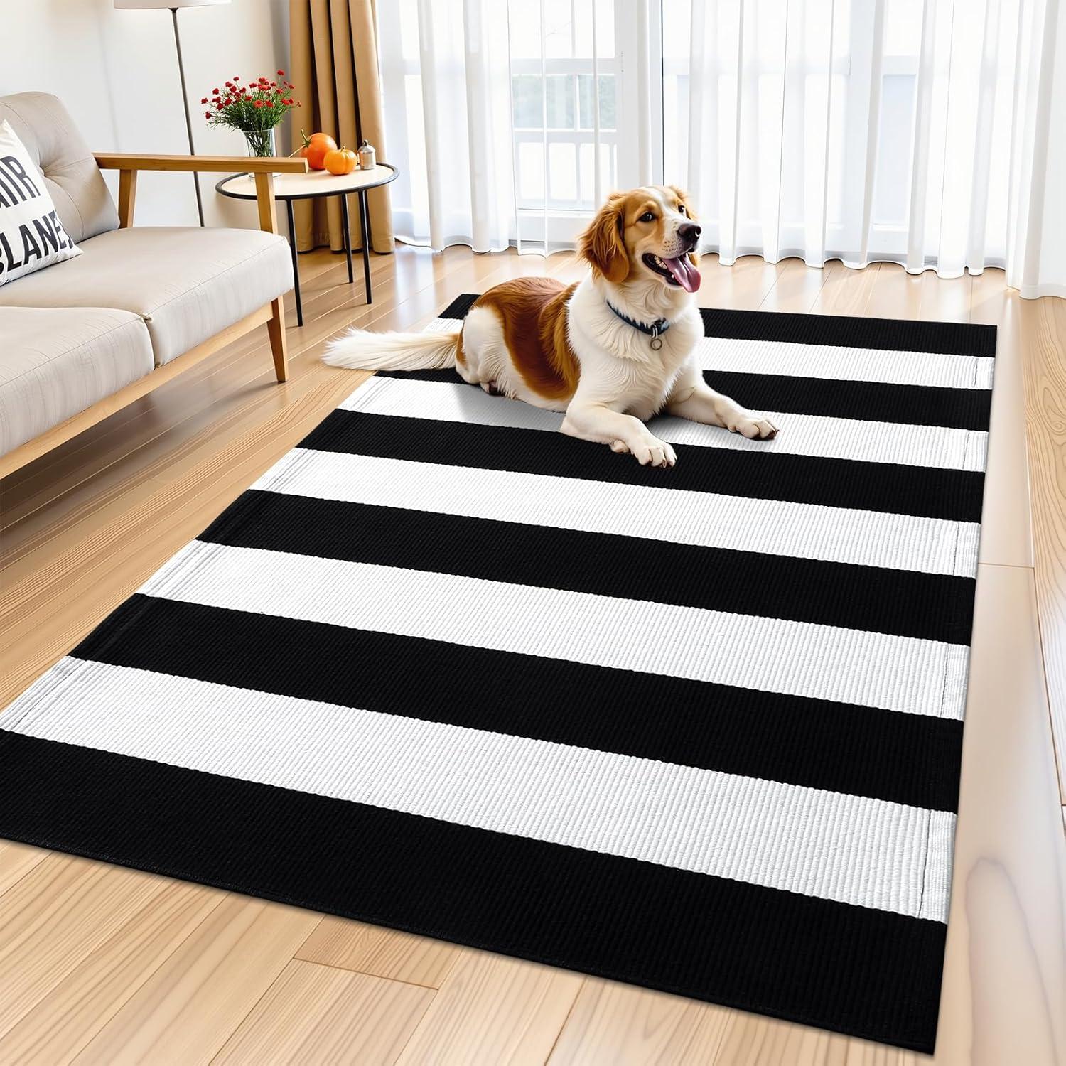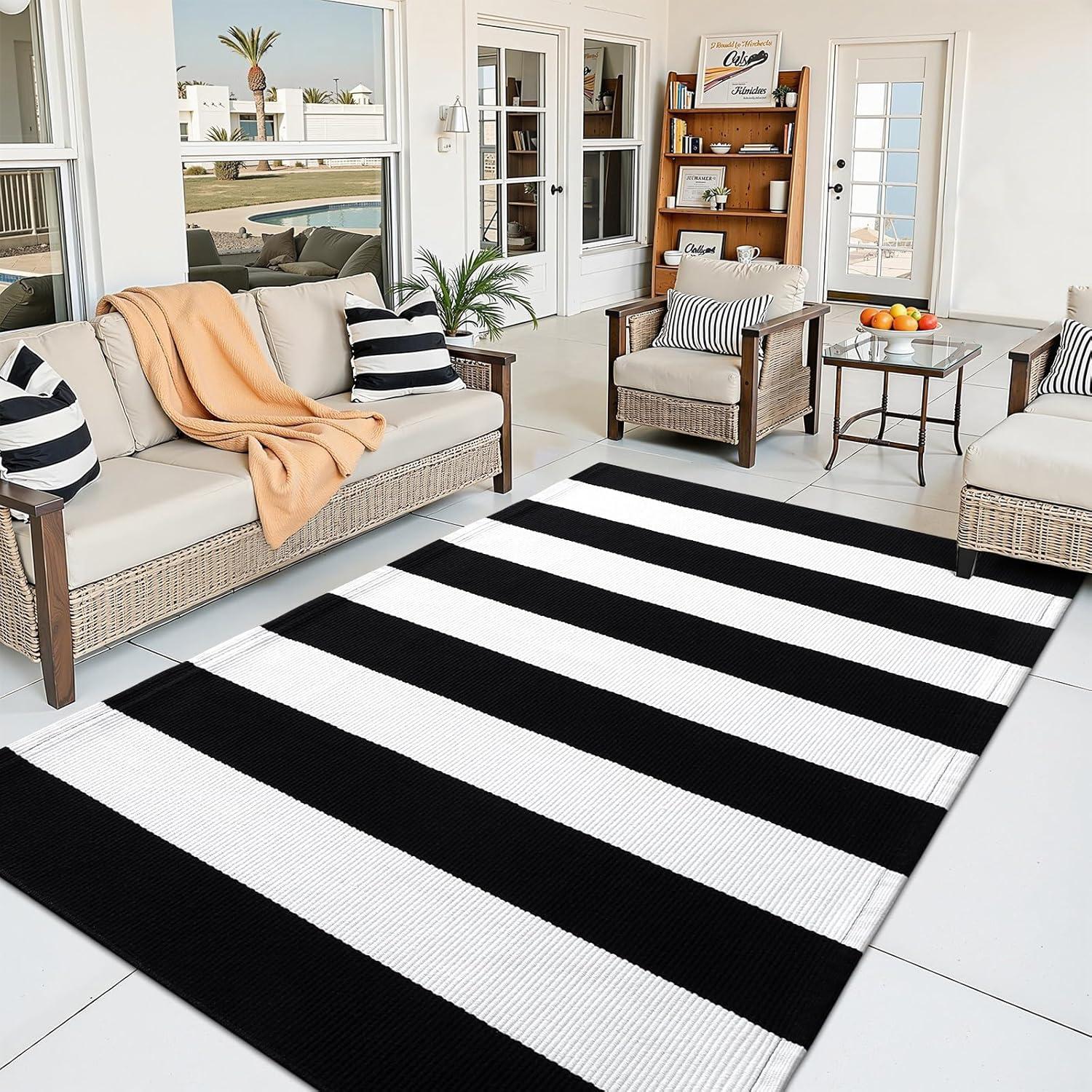 [Hardwearing Cotton Blend Fabric] This black and white striped rug is handwoven from a thick cotton-polyester blend with a dense low pile, making it a durable farmhouse rug that absorbs well, breathes easily, and resists loosening or fading. Perfect for long-lasting style and comfort in your entryway rug, front porch rug, or living room accent mat.
