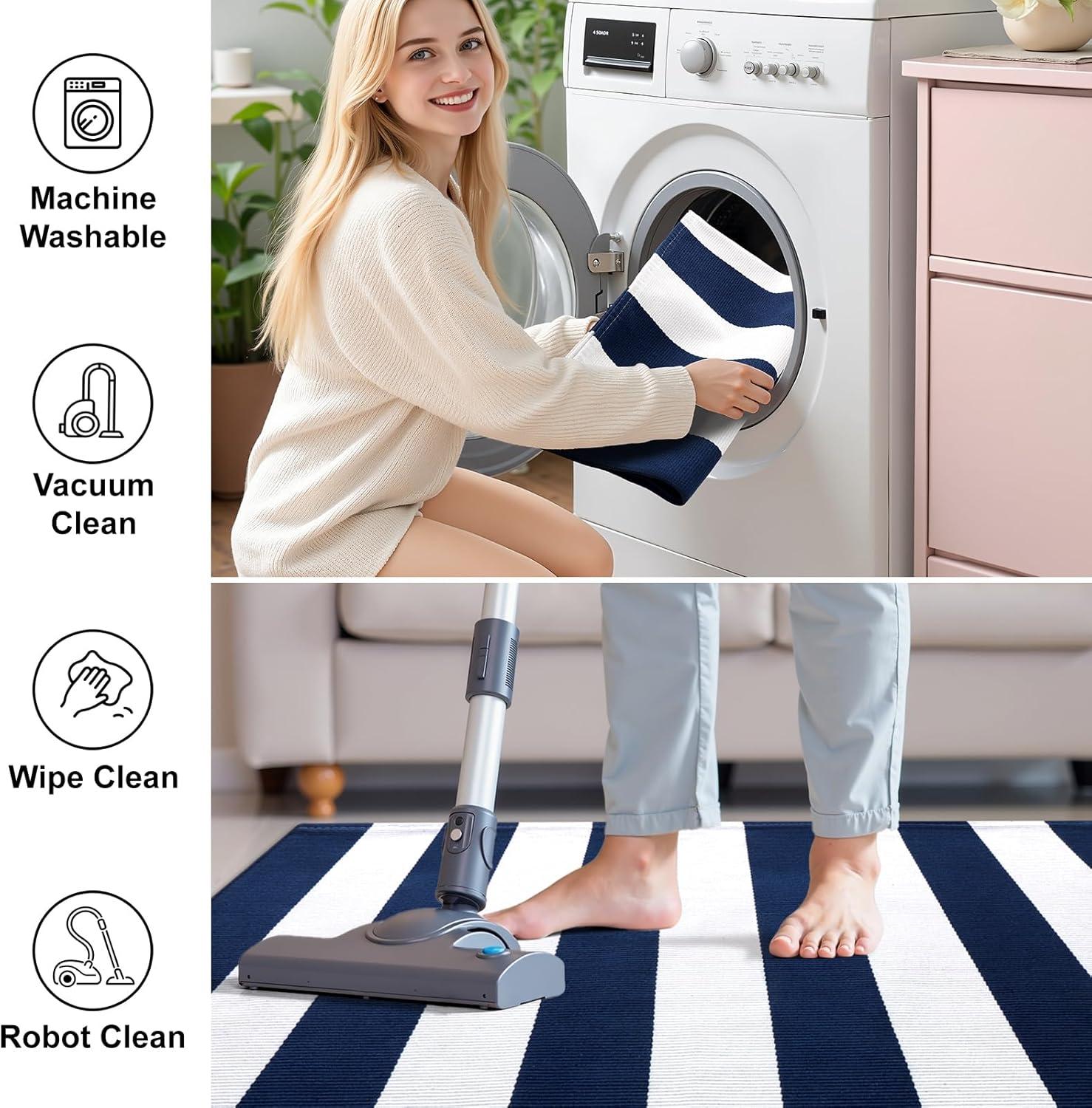 [Easy to Clean & Maintain] Keep your cotton blend striped rug fresh with minimal effort—vacuum or shake to remove dirt, or machine wash on a gentle cycle for deeper cleaning. Air dry or tumble dry on low to protect the fabric. Do not bleach. This easy-care farmhouse entry rug offers both practicality and timeless style.