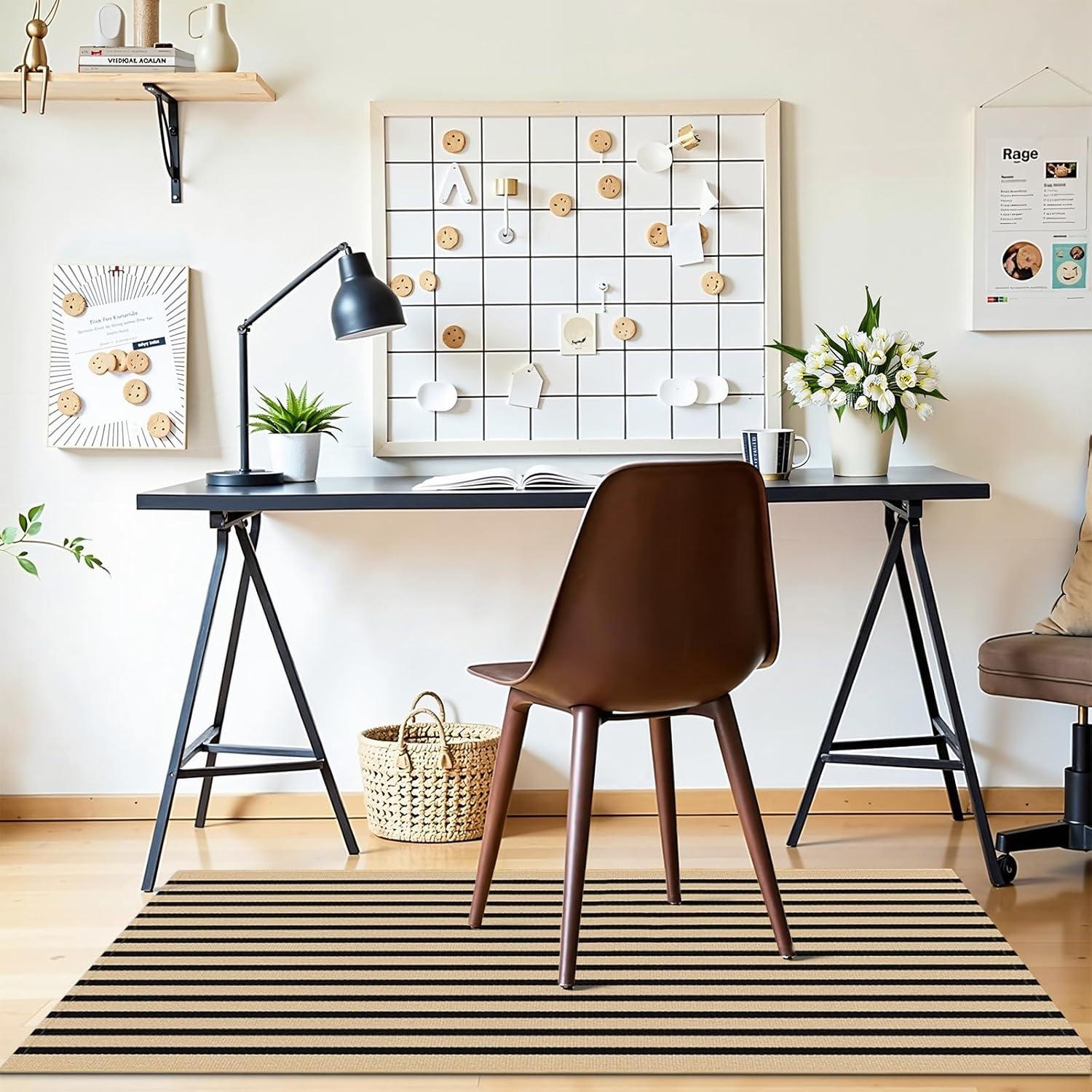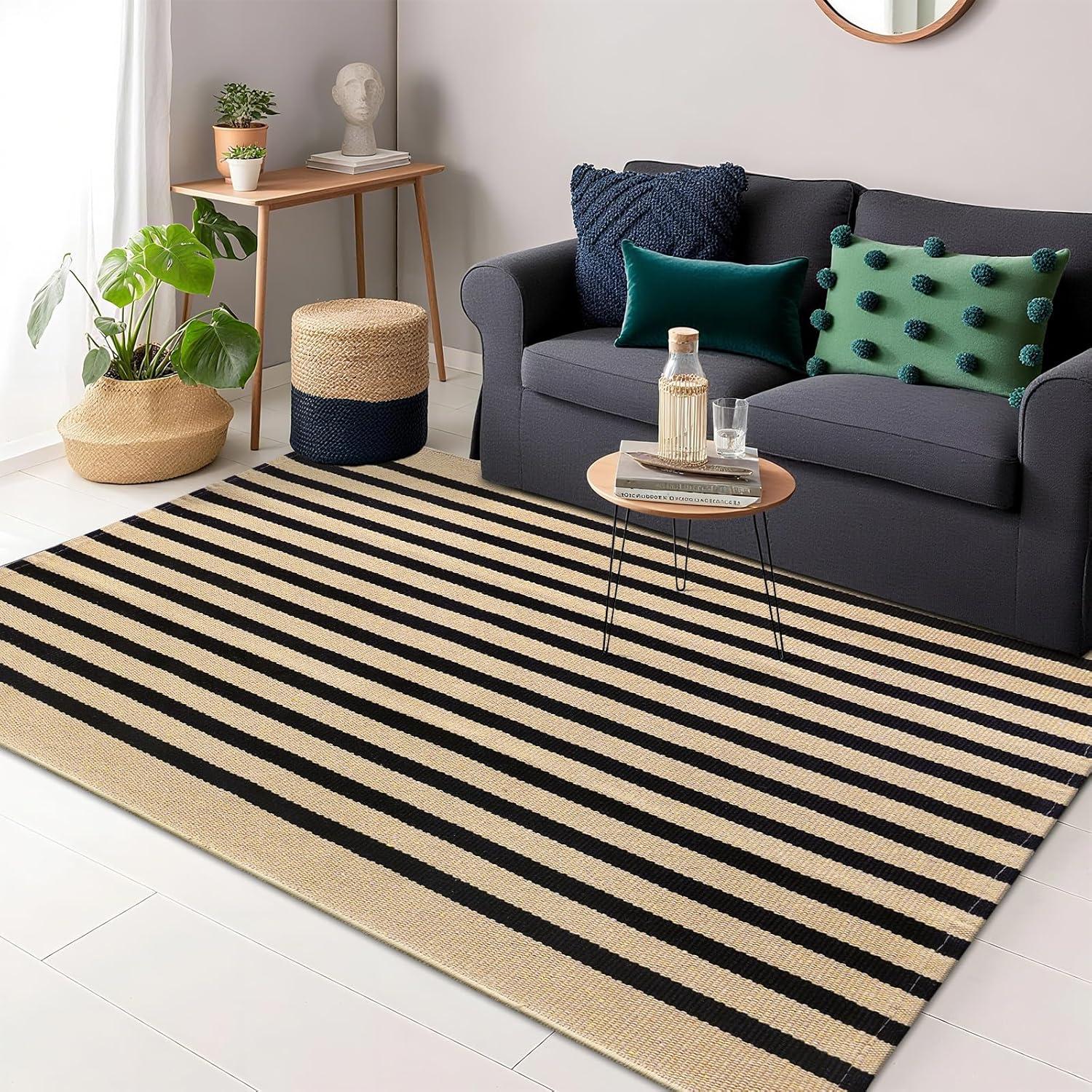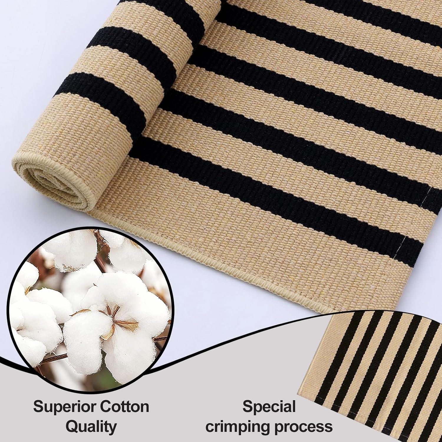 Elevate your home decor with this brown and black striped rug, a perfect blend of farmhouse charm and modern simplicity. Woven from a soft yet durable cotton-polyester blend, it features a dense low pile that offers excellent water absorption, breathability, and long-lasting durability. This versatile indoor outdoor rug suits a variety of spaces—layer it on your front porch for a welcoming entryway, place it under an accent table in the living room, or use it as a stylish touch in the kitchen, patio, or bedroom. Its timeless striped pattern complements seasonal updates and makes a thoughtful holiday gift. Cleaning is effortless—simply vacuum, shake, or machine wash on a gentle cycle, then air dry. For outdoor use, protect the rug from prolonged moisture. For safety, pair it with a non-slip pad as the rug does not include a backing. Bring warmth, style, and practicality to your home with this washable striped rug, designed to enhance everyday living with comfort and charm.