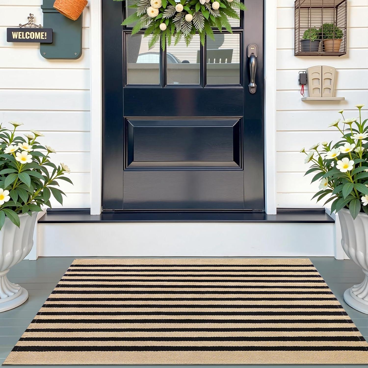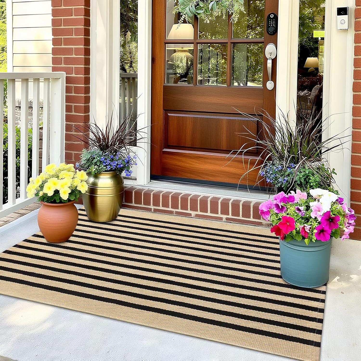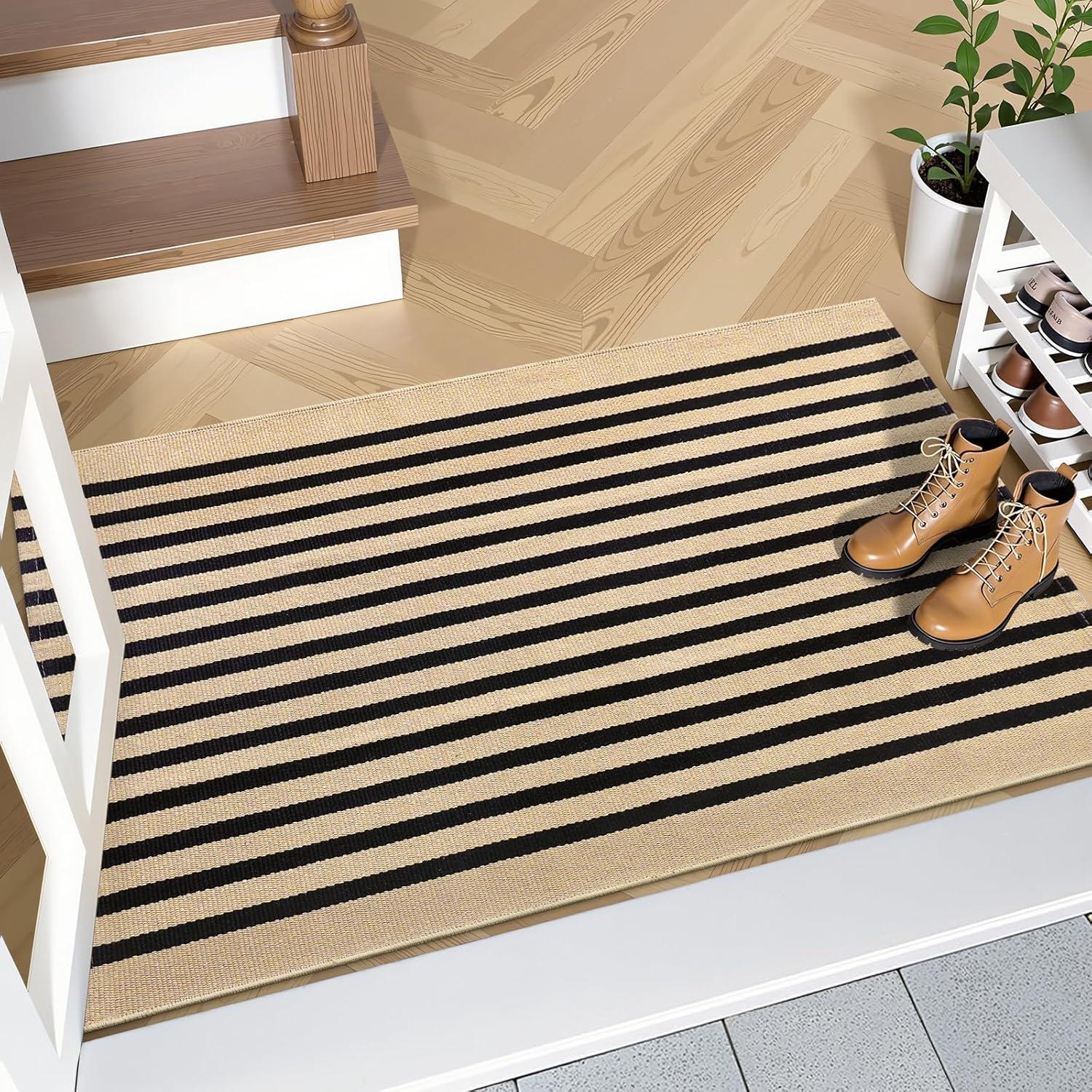 OLANLY Brown and Black Striped Rug 2′ x 4’3″ (24″ x 51″) – Washable Cotton Doormat for Indoor Outdoor Use, Layered Front Porch Rug for Entryway, Kitchen, Patio(Black and White Striped)