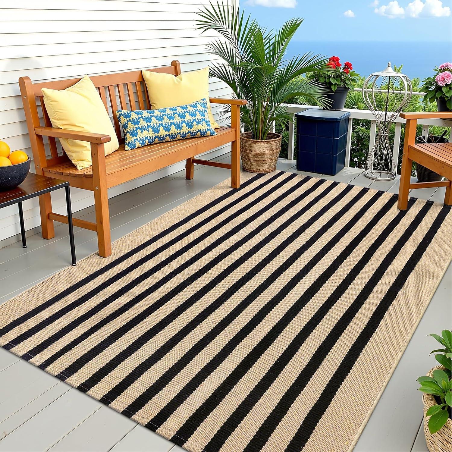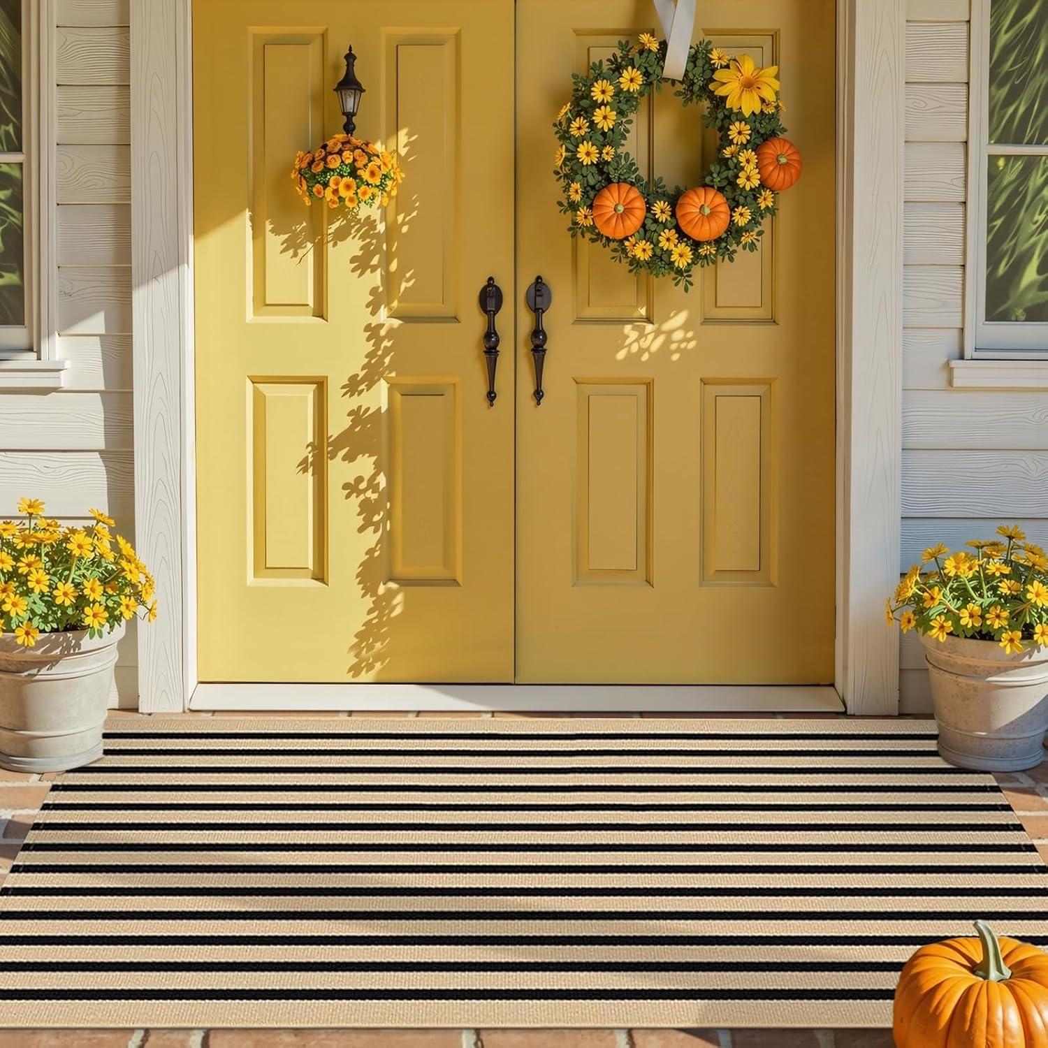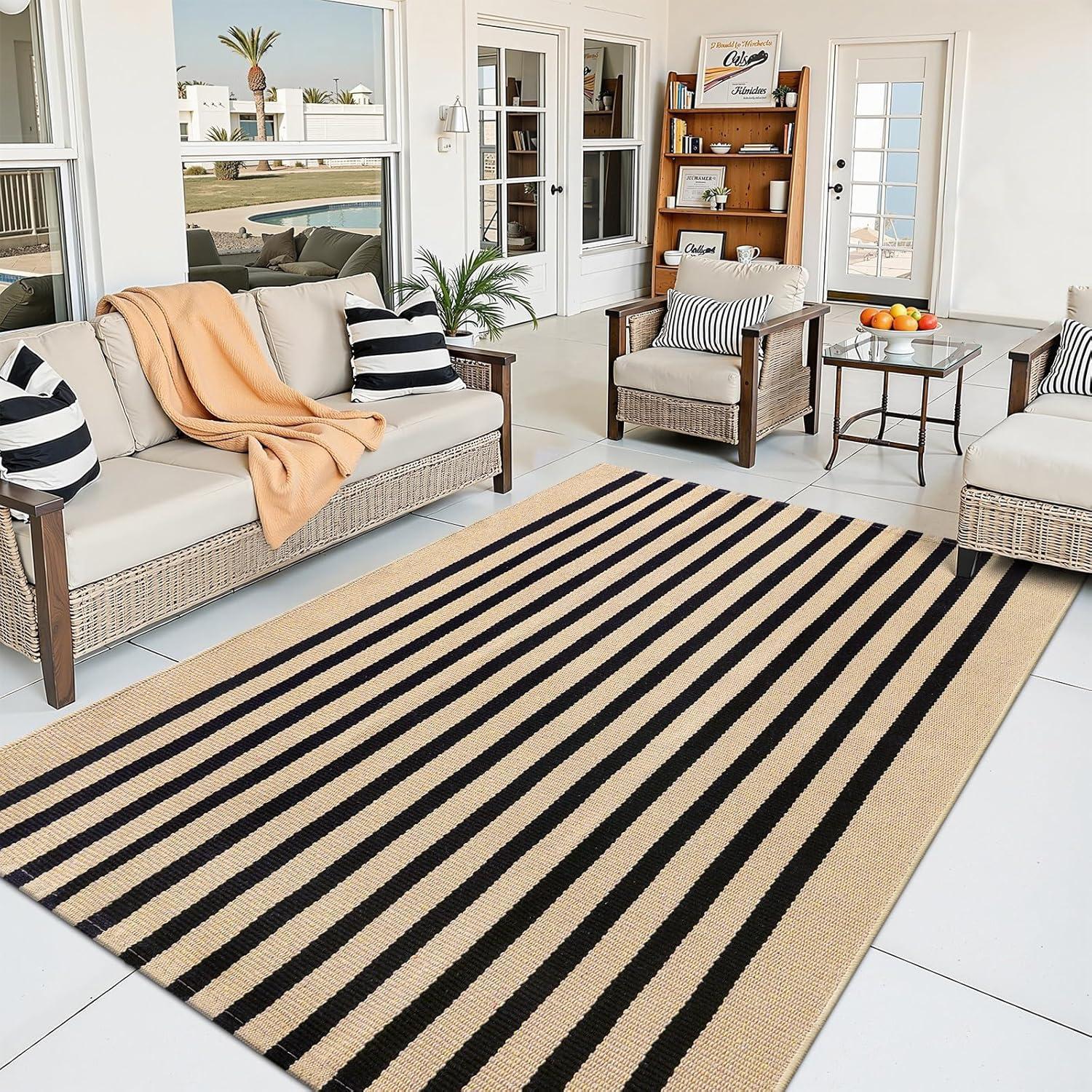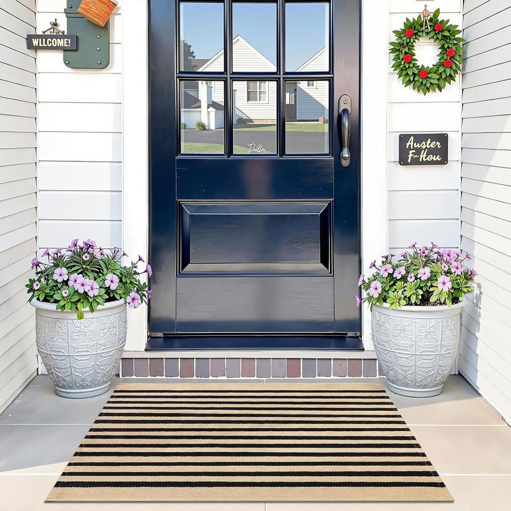 [Outdoor Care Tips] Designed as a versatile indoor outdoor rug, this striped mat is suitable for patios, porches, or kitchens. For outdoor use, avoid prolonged exposure to rain, as moisture may damage the fabric. If the rug gets wet, promptly clean and dry it to maintain quality and extend its lifespan.