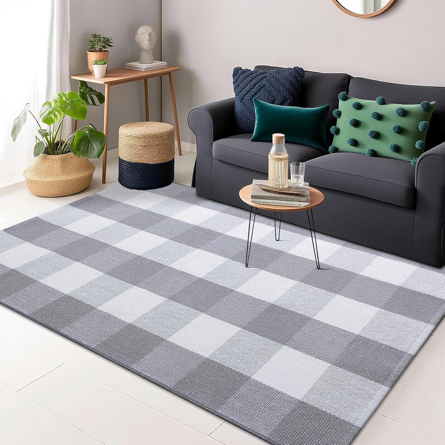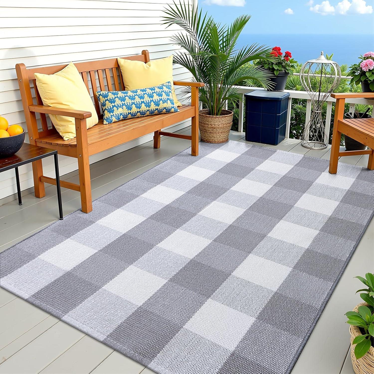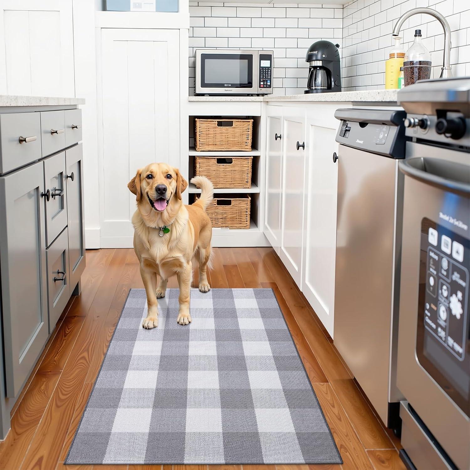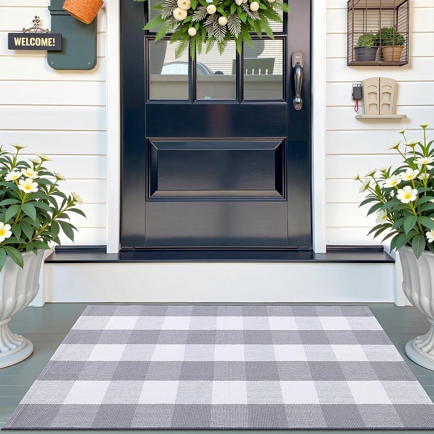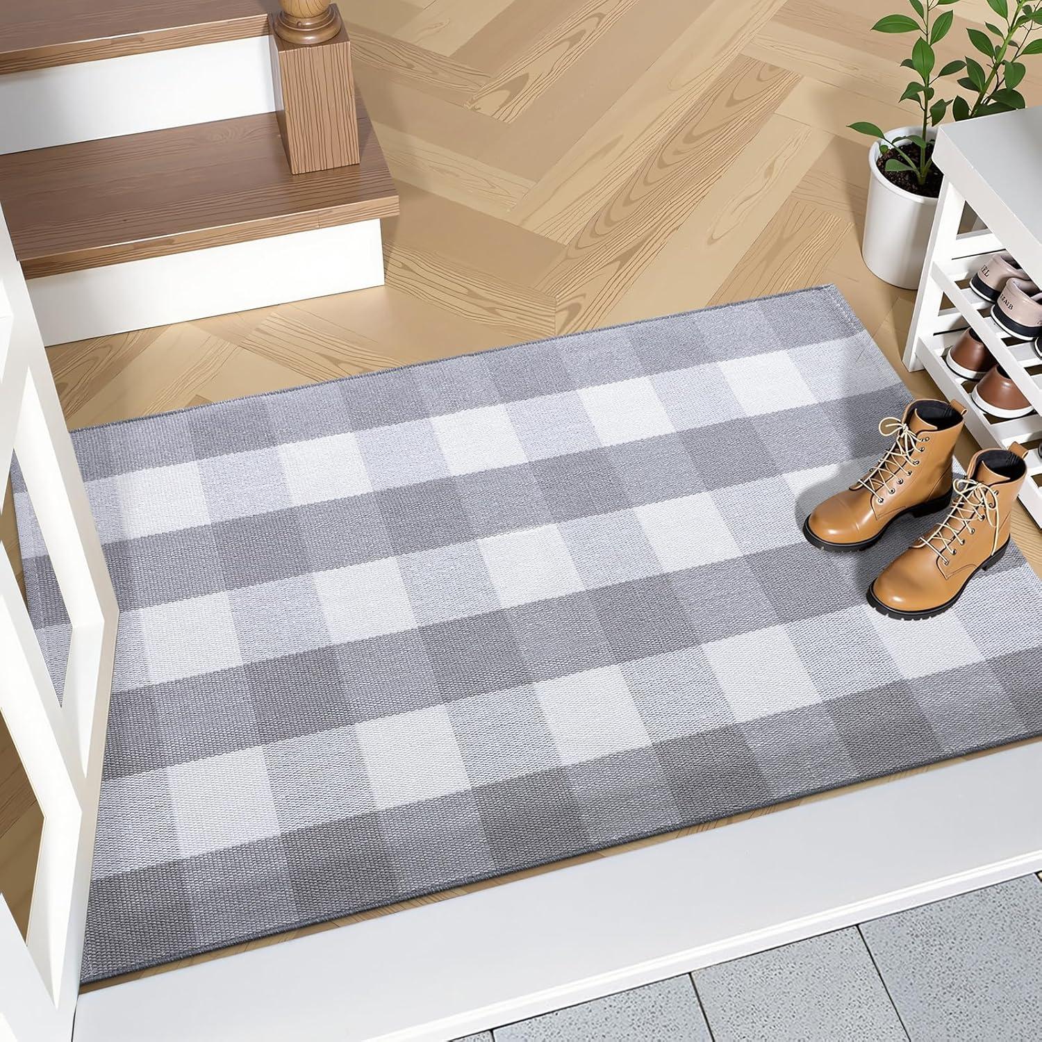 OLANLY Brown and Black Striped Rug 2′ x 4’3″ (24″ x 51″) – Washable Cotton Doormat for Indoor Outdoor Use, Layered Front Porch Rug for Entryway, Kitchen, Patio(Grey and White Checkered)