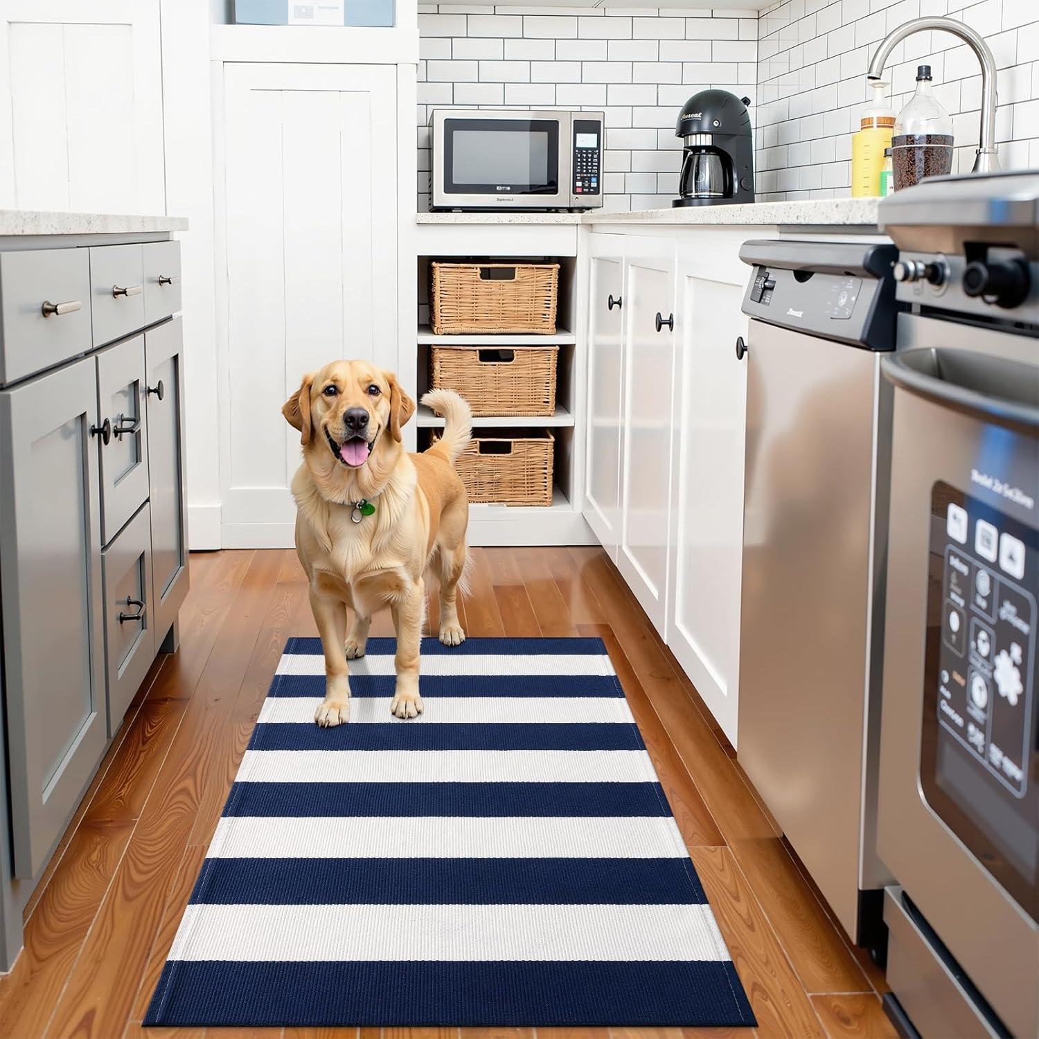 OLANLY Brown and Black Striped Rug 2′ x 4’3″ (24″ x 51″) – Washable Cotton Doormat for Indoor Outdoor Use, Layered Front Porch Rug for Entryway, Kitchen, Patio(Navy and White Striped)