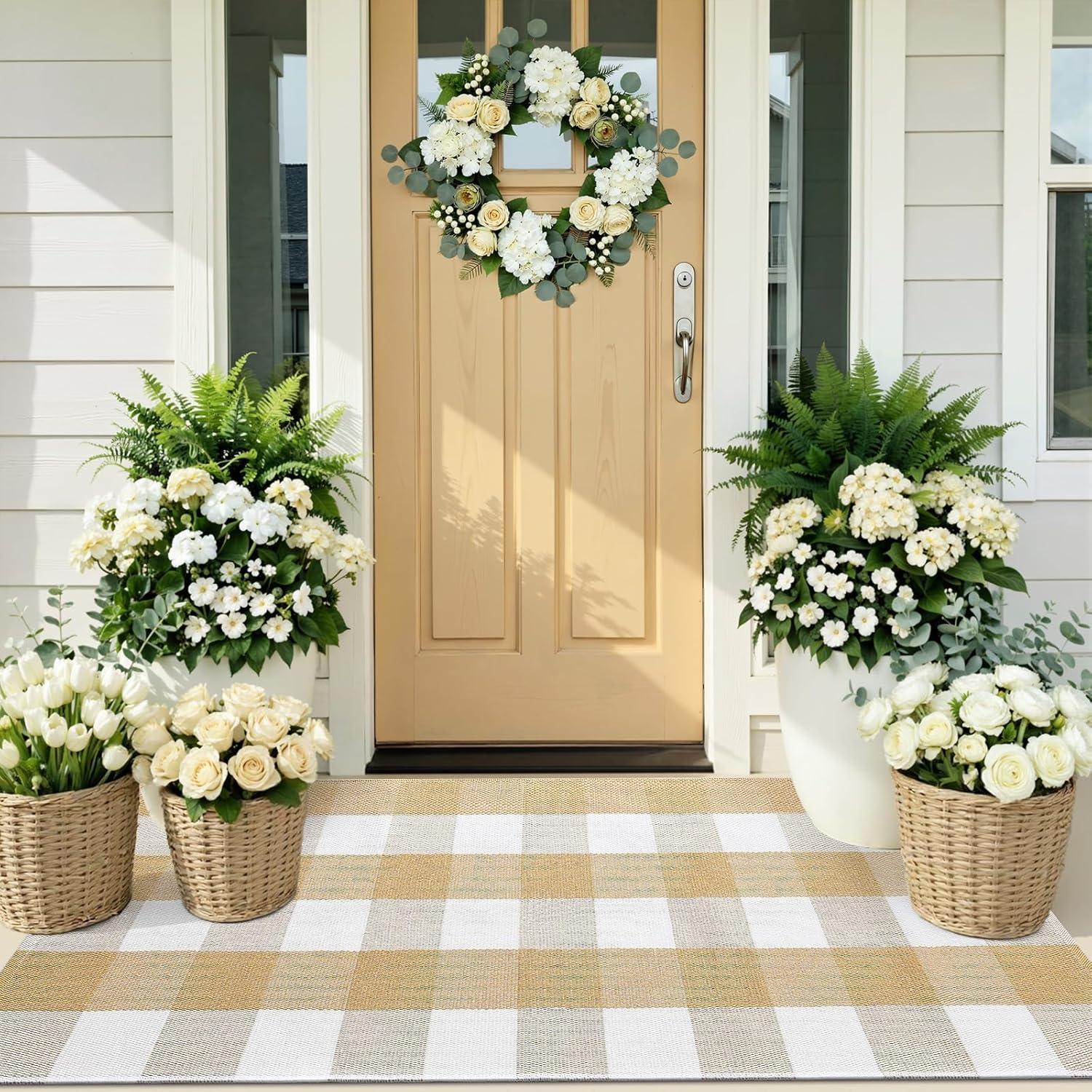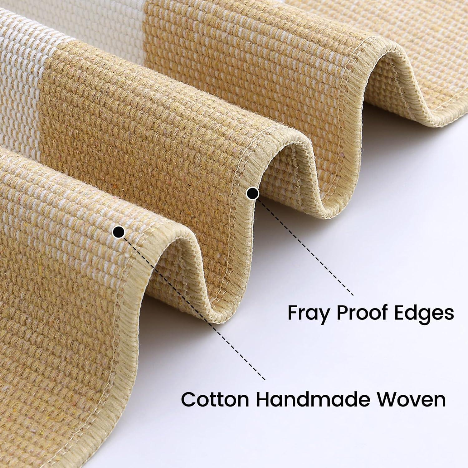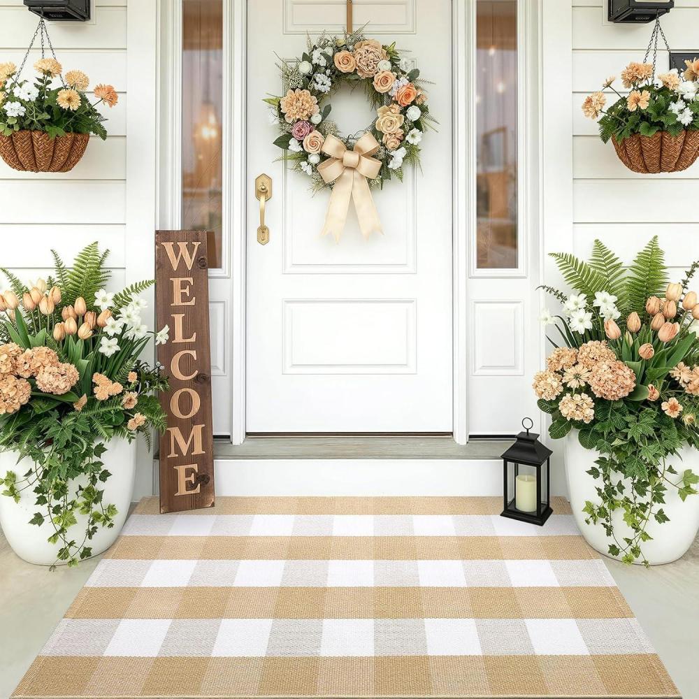 [Hardwearing Cotton Blend Fabric] This beige and white plaid rug is handwoven from a thick cotton-polyester blend with a dense low pile, making it a durable farmhouse rug that absorbs well, breathes easily, and resists loosening or fading. Perfect for long-lasting style and comfort in your entryway rug, front porch rug, or living room accent mat.