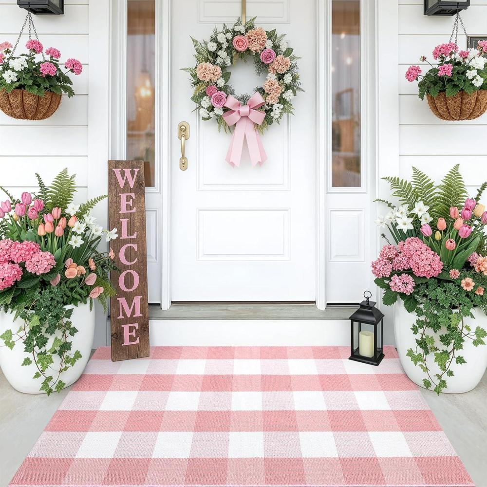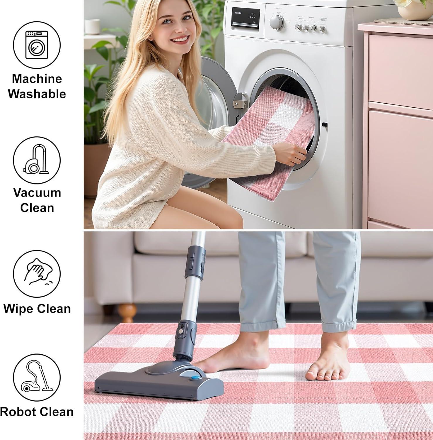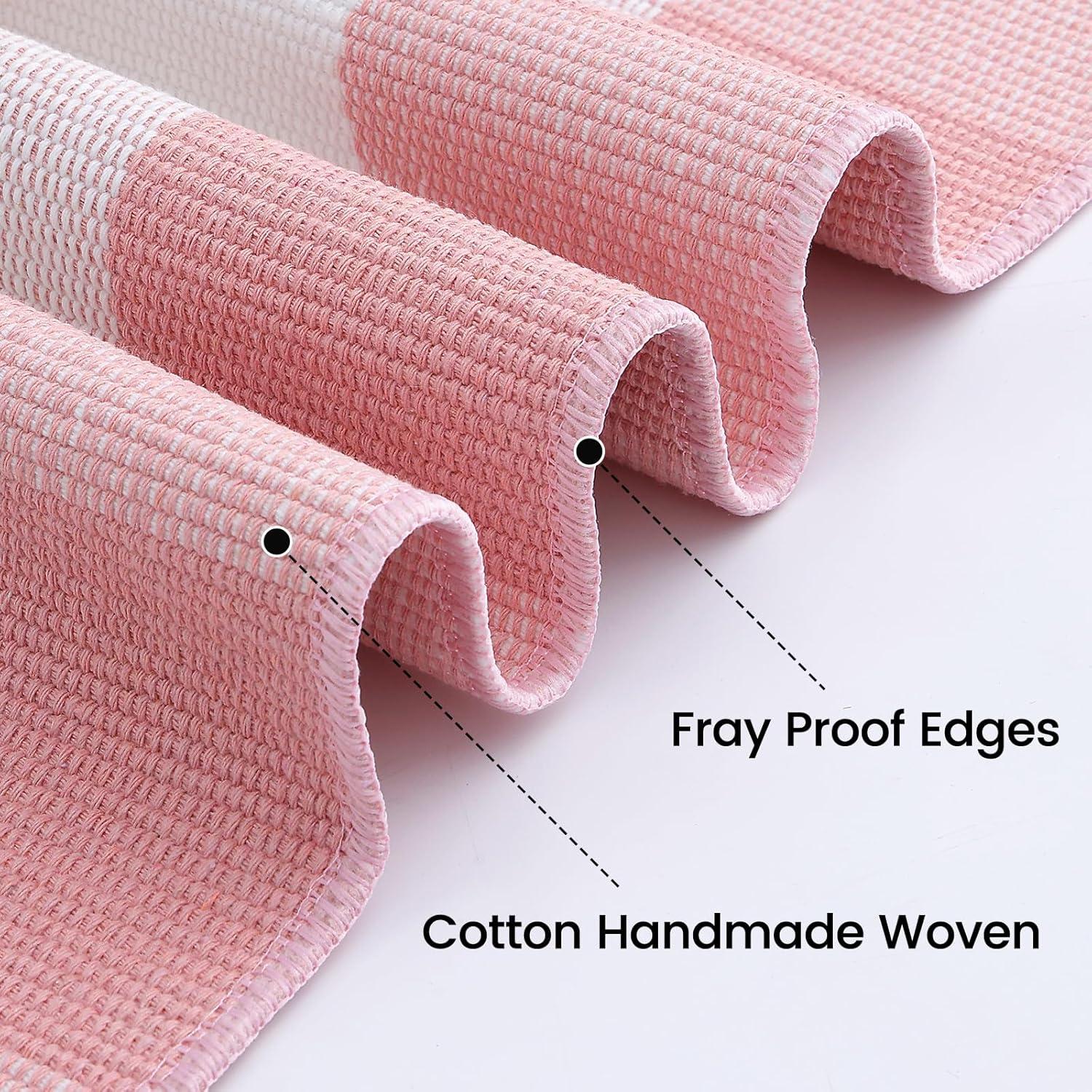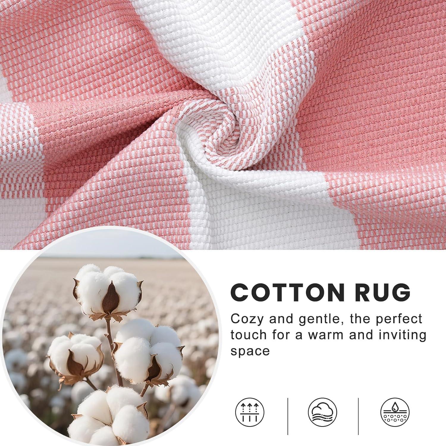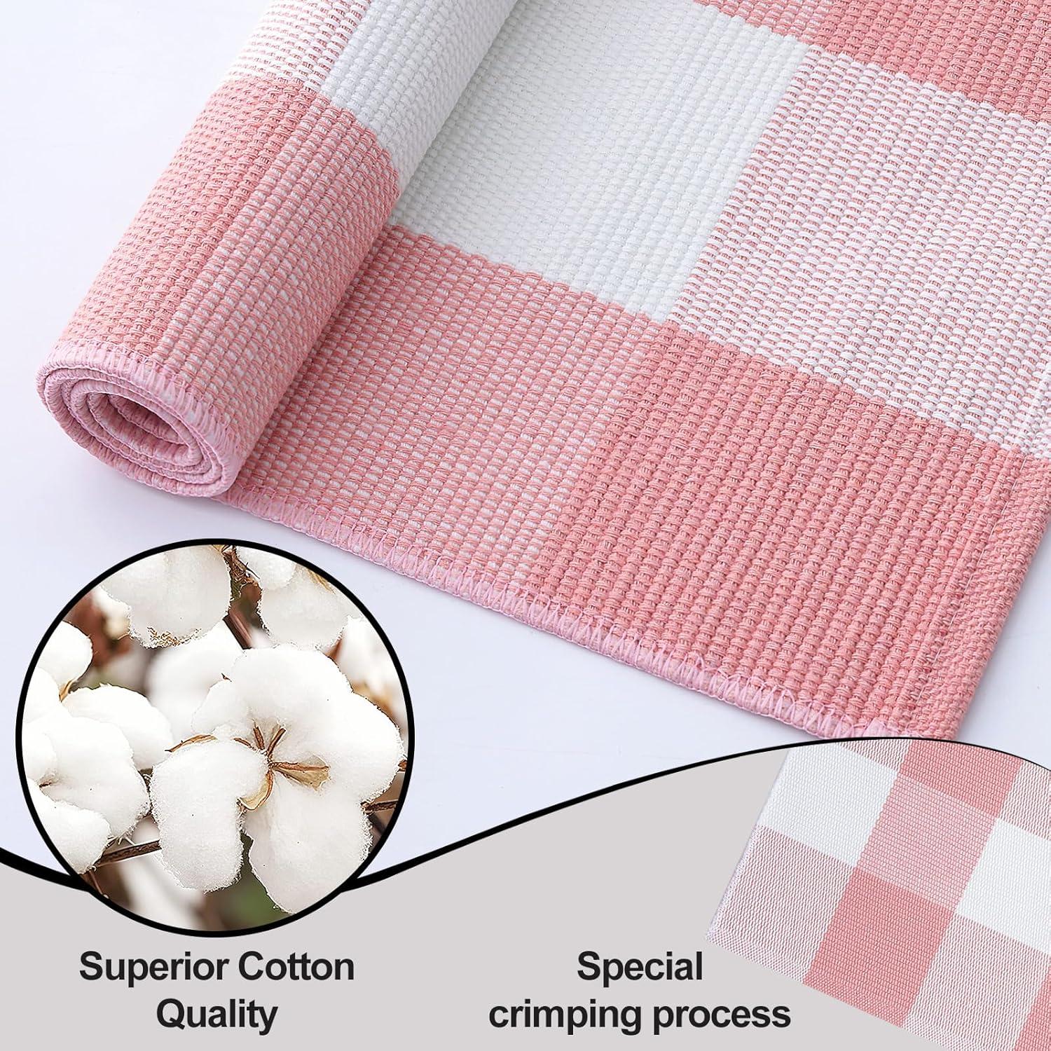 [Hardwearing Cotton Blend Fabric] This pink and white plaid rug is handwoven from a thick cotton-polyester blend with a dense low pile, making it a durable farmhouse rug that absorbs well, breathes easily, and resists loosening or fading. Perfect for long-lasting style and comfort in your entryway rug, front porch rug, or living room accent mat.