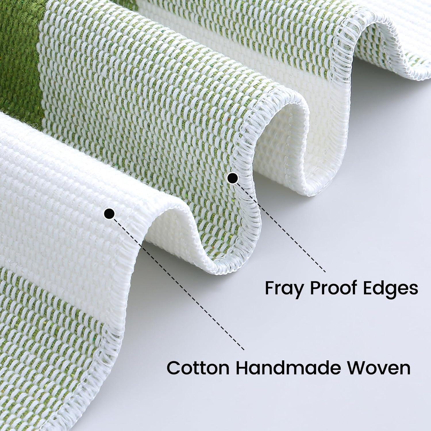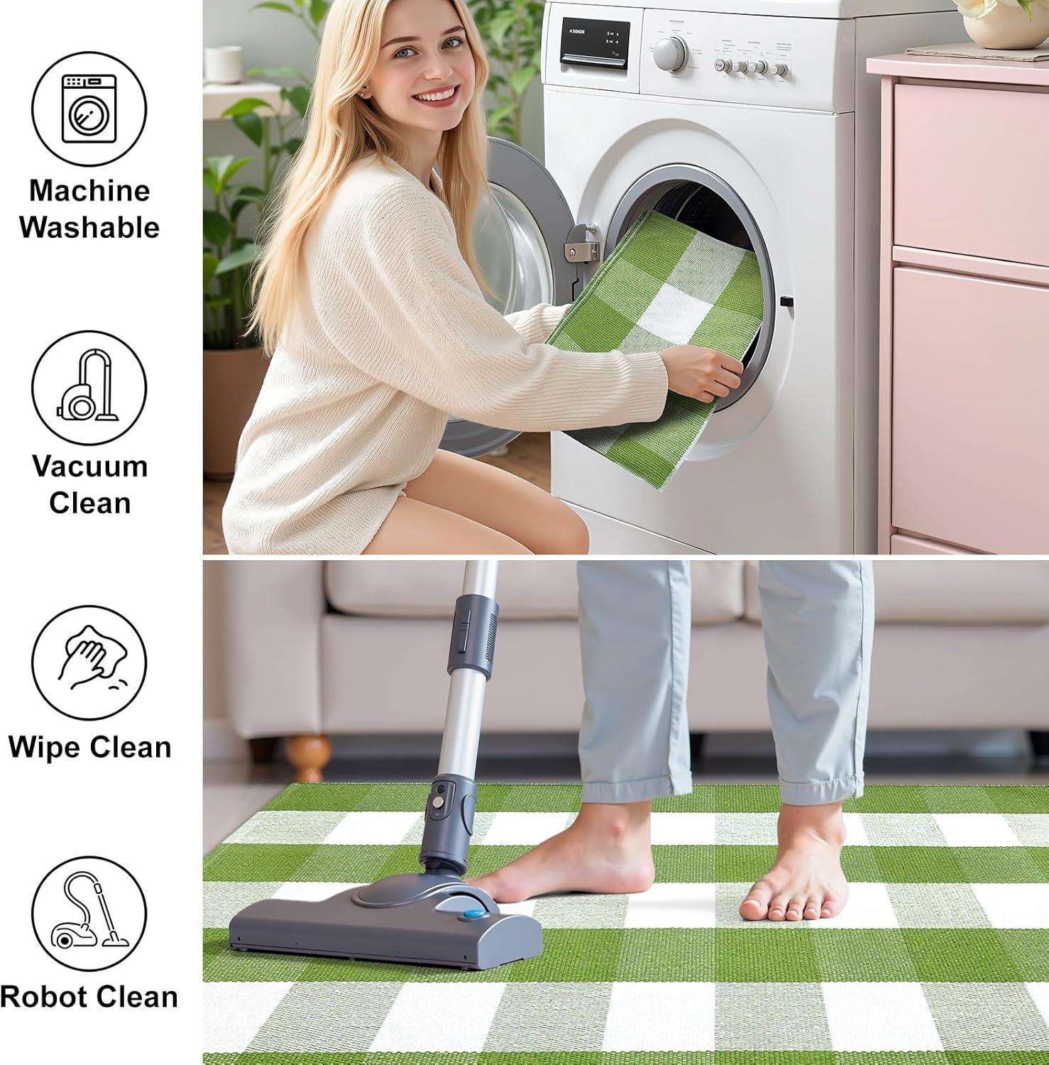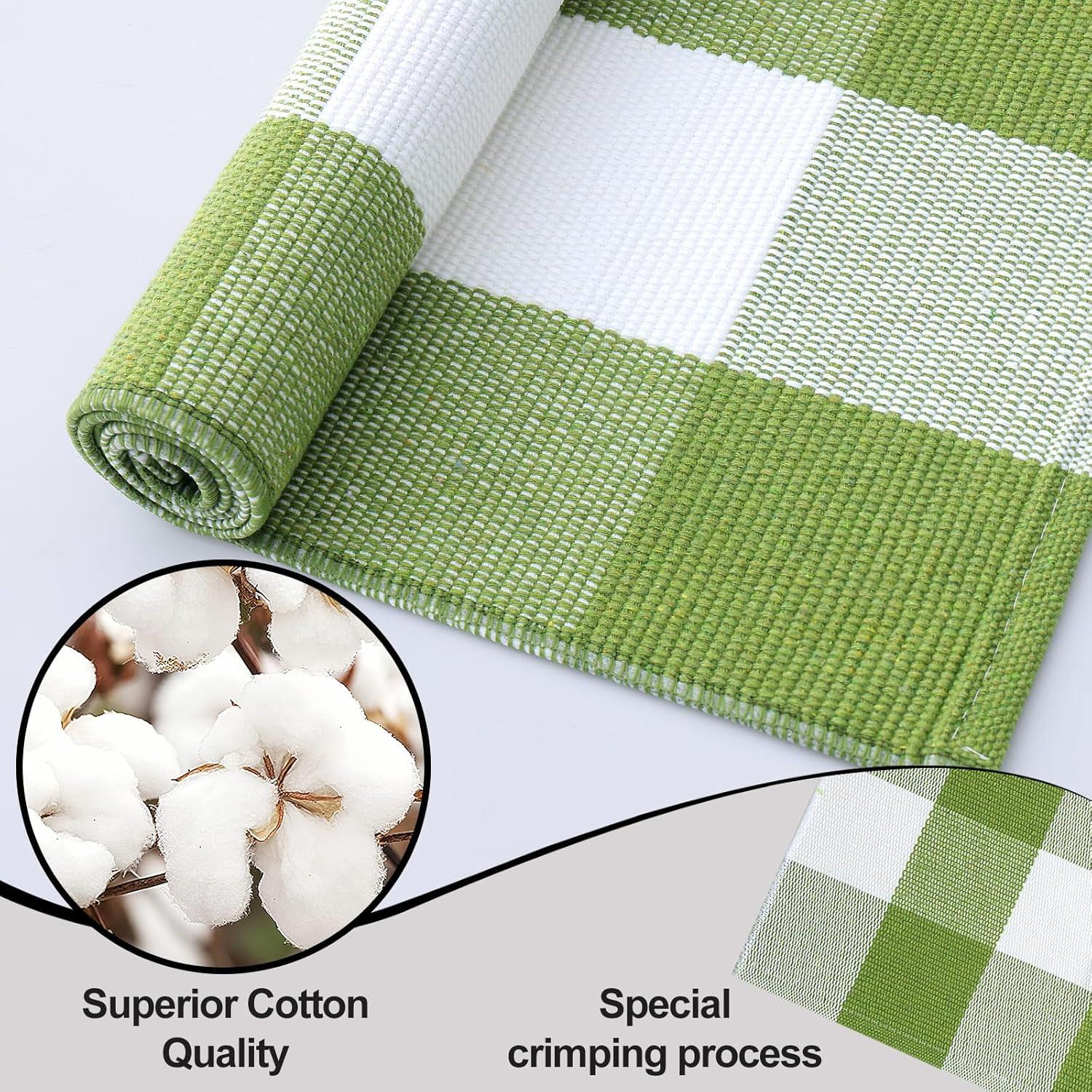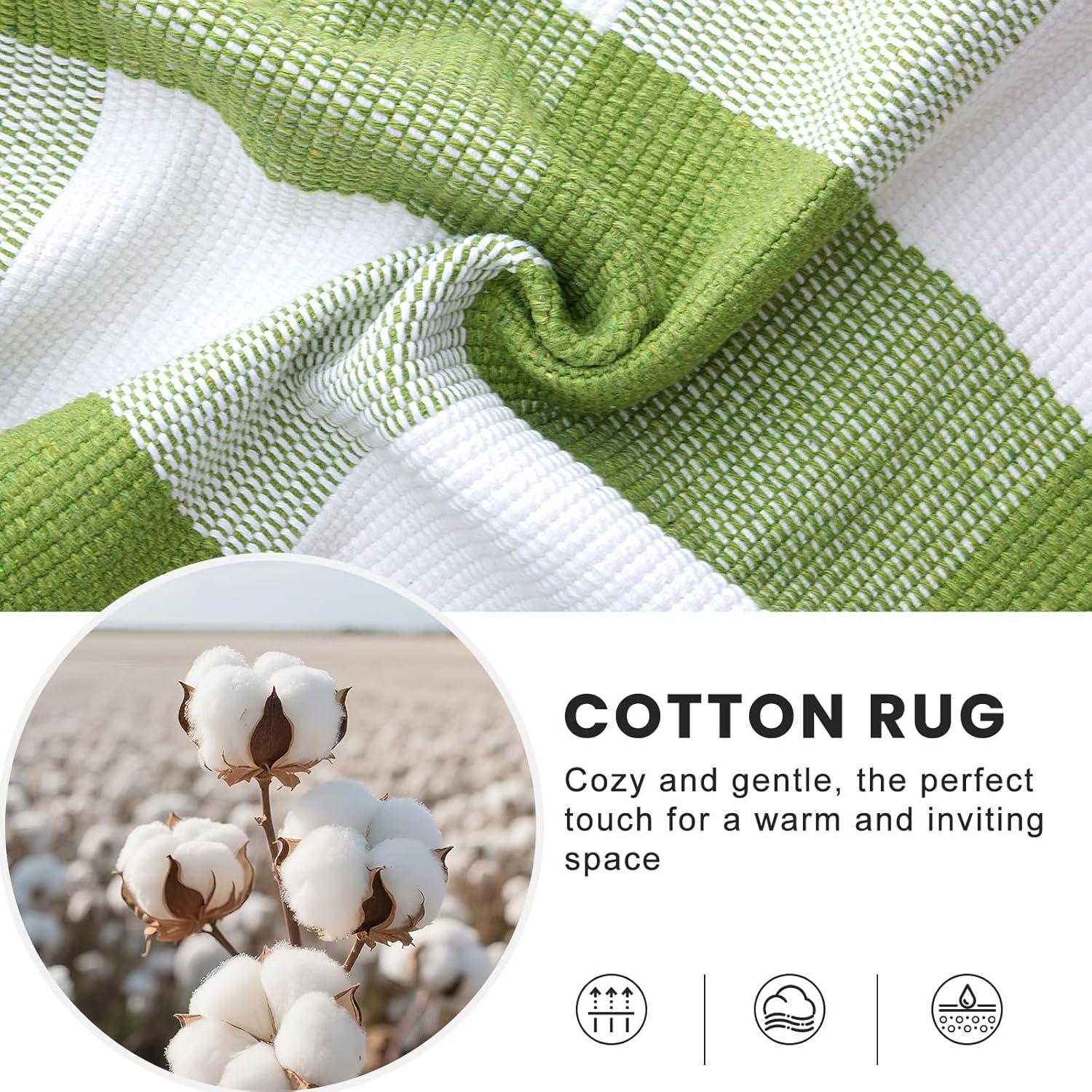 [Hardwearing Cotton Blend Fabric] This green and white plaid rug is handwoven from a thick cotton-polyester blend with a dense low pile, making it a durable farmhouse rug that absorbs well, breathes easily, and resists loosening or fading. Perfect for long-lasting style and comfort in your entryway rug, front porch rug, or living room accent mat.