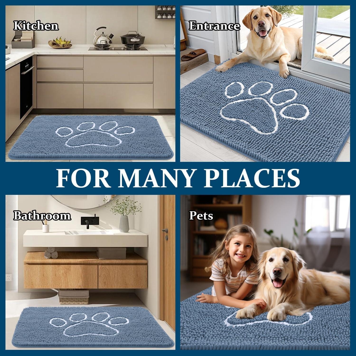 OLANLY Dog Door Mat for Muddy Paws 32x20, Paw Print Design, Absorbs Moisture and Dirt, Non-Slip Washable Doormat, Quick Dry Chenille Mud Mat, Entry Indoor Entryway Carpet, Airy Blue and White