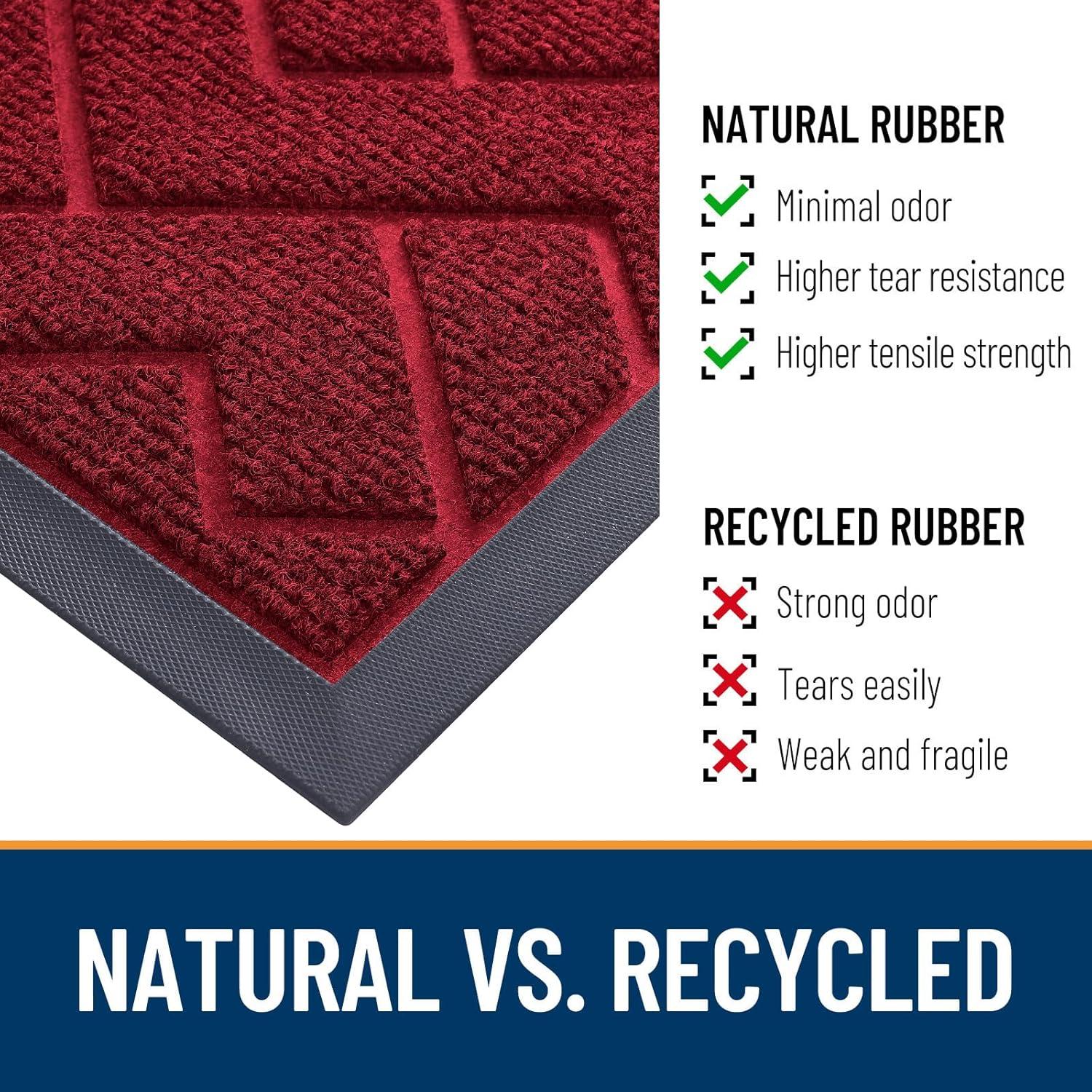 [CAPTURES DIRT AND MOISTURE] OLANLY's doormat is designed with deep grooves and a beveled rubber border to trap dirt and lock in moisture effectively. The natural rubber backing offers superior tensile strength, improved tear resistance, and reduced odor compared to synthetic materials. This design ensures shoes stay free from water, dust, and debris, making it a dependable and practical addition to any entryway.