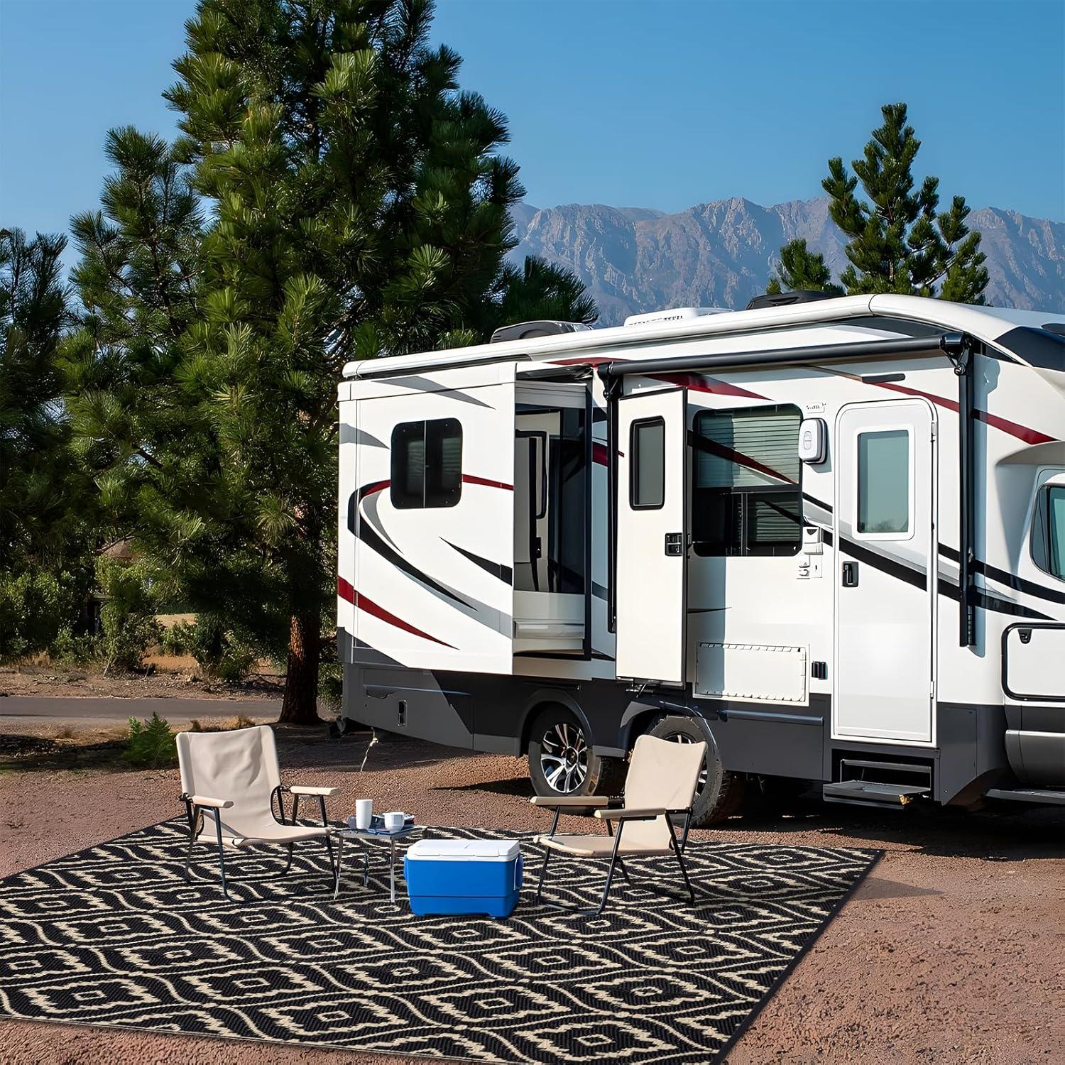 Reversible & Versatile: Featuring a modern geometric pattern on both sides, this indoor outdoor rug is designed for versatility. Simply flip it over for an instant style refresh. Perfect for patios, porches, RV campsites, and more, this camping rug adapts effortlessly to any setting.