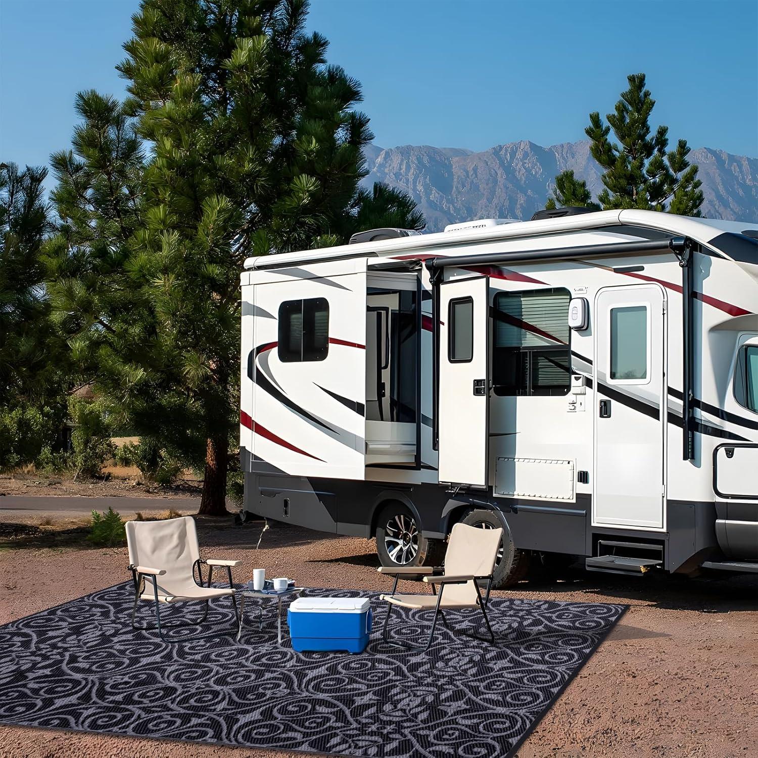 OLANLY Outdoor Rug Waterproof 5×8 ft Clearance, Reversible Outdoor Plastic Straw Rug with Floral Pattern, RV Mat for Patio, Camping, Balcony, Deck, Backyard, Black & White(Black & Grey)