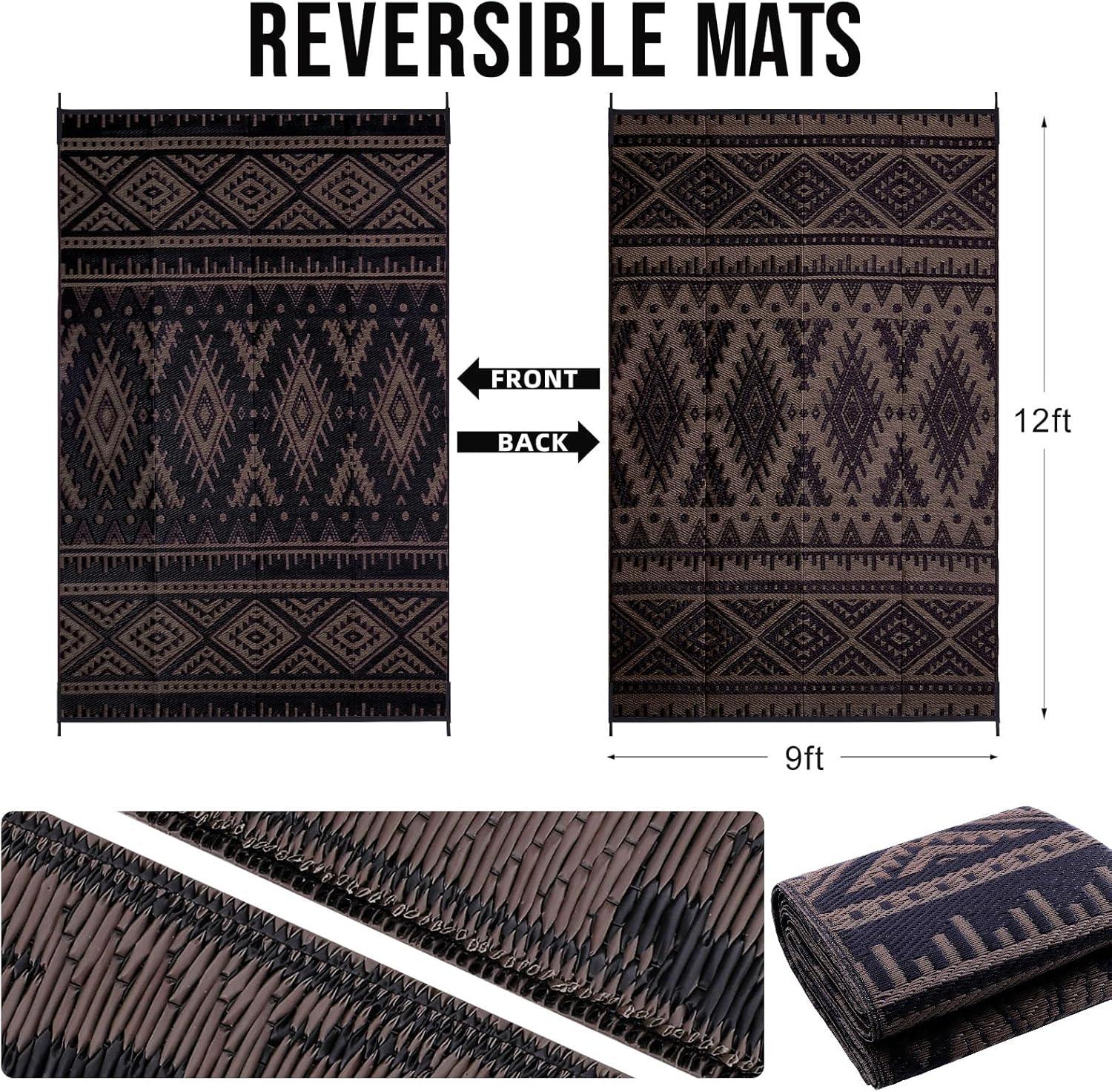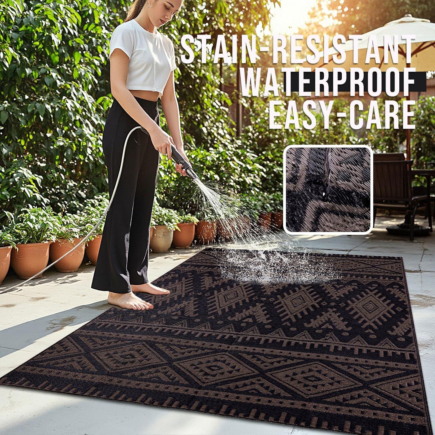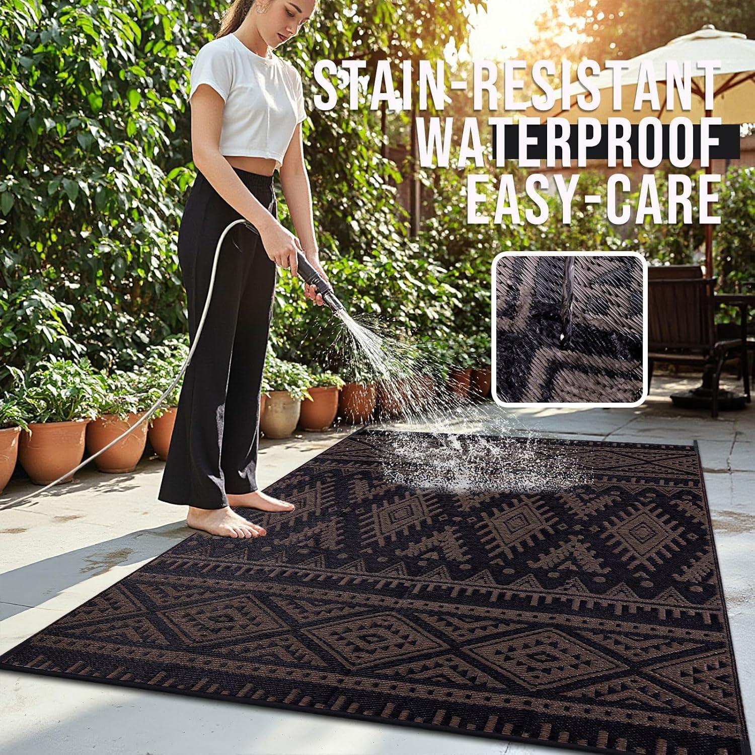 OLANLY Outdoor Rug Waterproof 6x9 ft, Reversible Outdoor Plastic Straw Rug, Boho Patio Rug, Indoor Outdoor Carpet, RV Mat Outside for Patio, Camp, Picnic, Balcony, Deck, Backyard, Black & White(Black & Brown)
