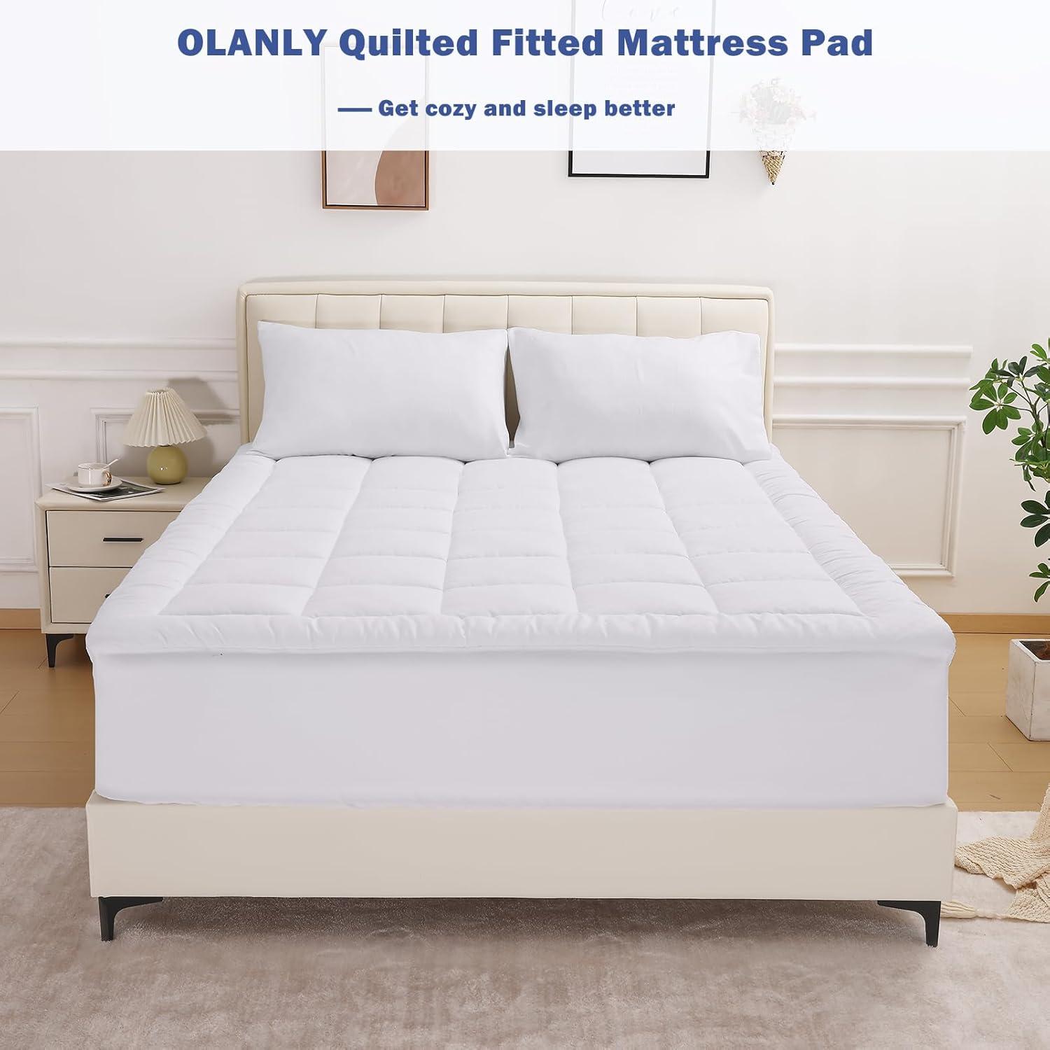OLANLY Queen Quilted Fitted Mattress Pad – Soft Pillow Top Mattress Topper, Down Alternative Fill, Cooling Comfort Breathable Mattress Cover, Machine Washable Deep Pocket Mattress Protector, White(White)