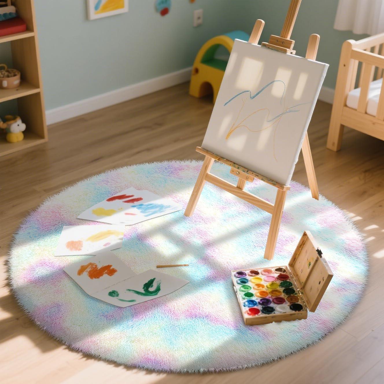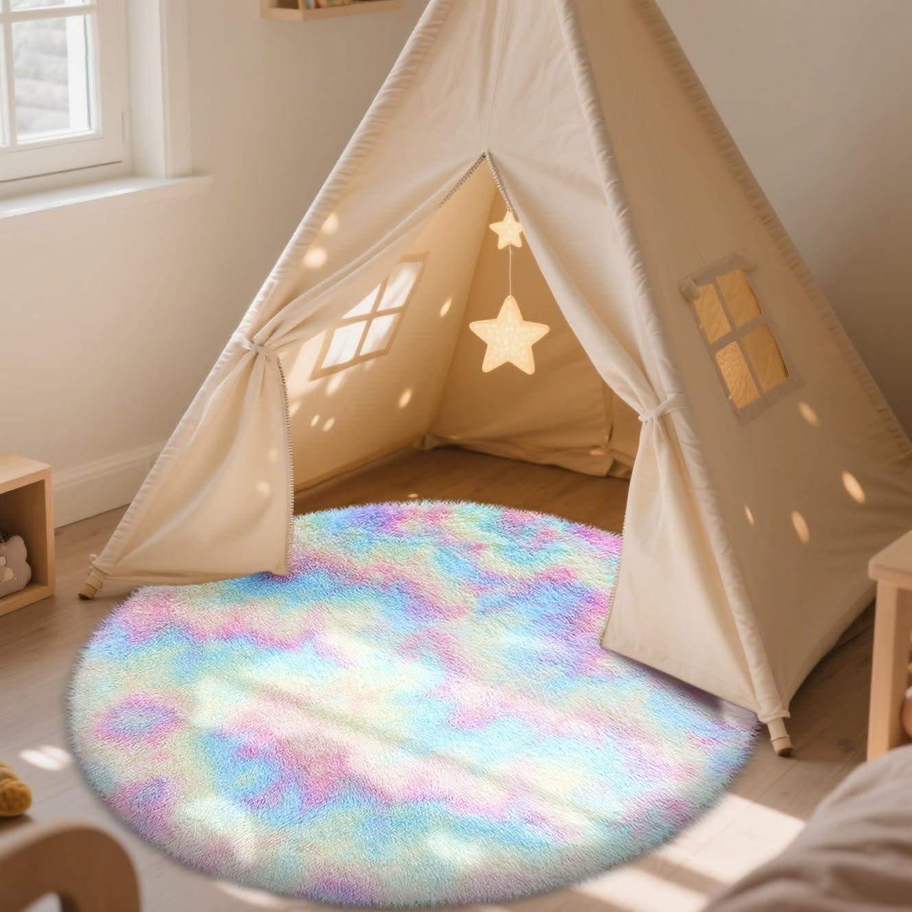 OLANLY Rainbow Round Rugs for Bedroom – Machine Washable, 3×3 Feet Circle Area Rugs for Living Room, Soft and Fluffy Shaggy Carpet for Teen Girls and Boys, Nursery Rooms, Dorms, Home Decor Aesthetic(Beige Tie-dye)