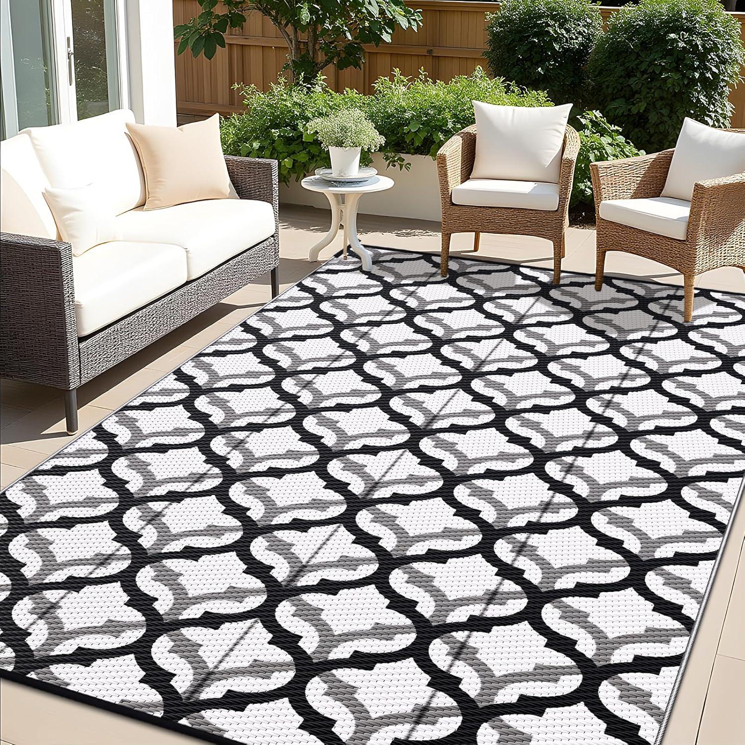 OLANLY Reversible Outdoor Rug 5x8 ft Clearance, Waterproof Outdoor Plastic Straw Rug with Interlacing Pattern, RV Mat for Patio, Camping, Balcony, Deck, Backyard, Black & White(Black & White)