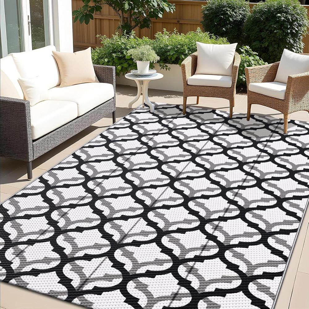 OLANLY Reversible Outdoor Rug 5×8 ft Clearance, Waterproof Outdoor Plastic Straw Rug with Interlacing Pattern, RV Mat for Patio, Camping, Balcony, Deck, Backyard, Black & White(Black & White)