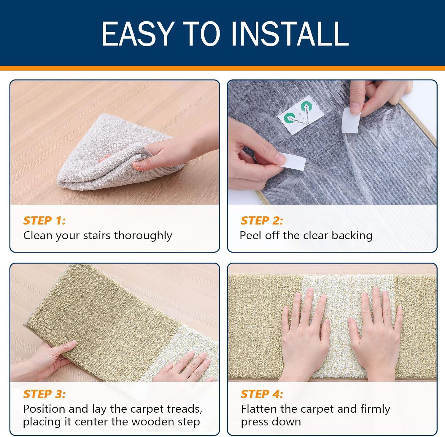 【Easy To Install】Steps: 1. Ensure your floor is clean and dry; 2. Peel off the backing film; 3. Adhere and press firmly to flatten. They protect your floors without leaving any glue residue when you easily remove these stair runner rugs