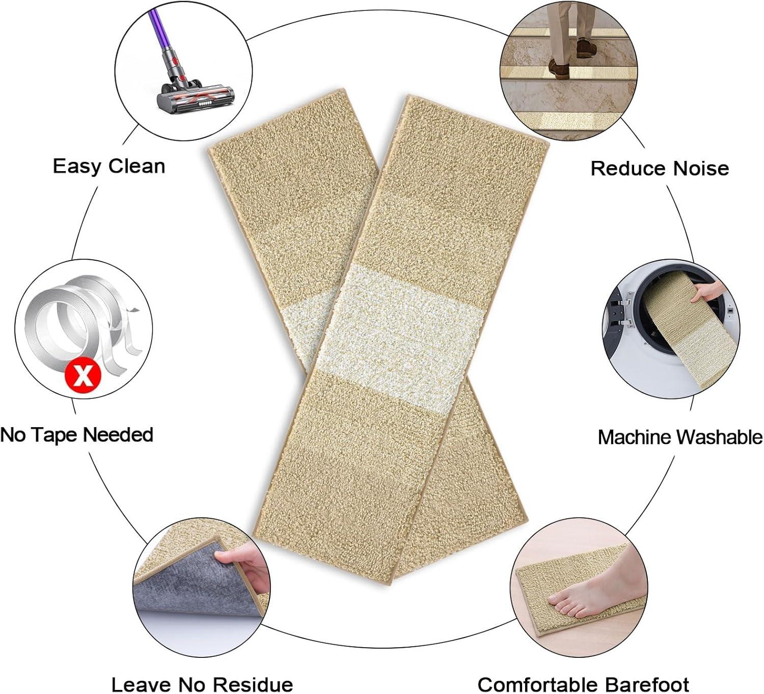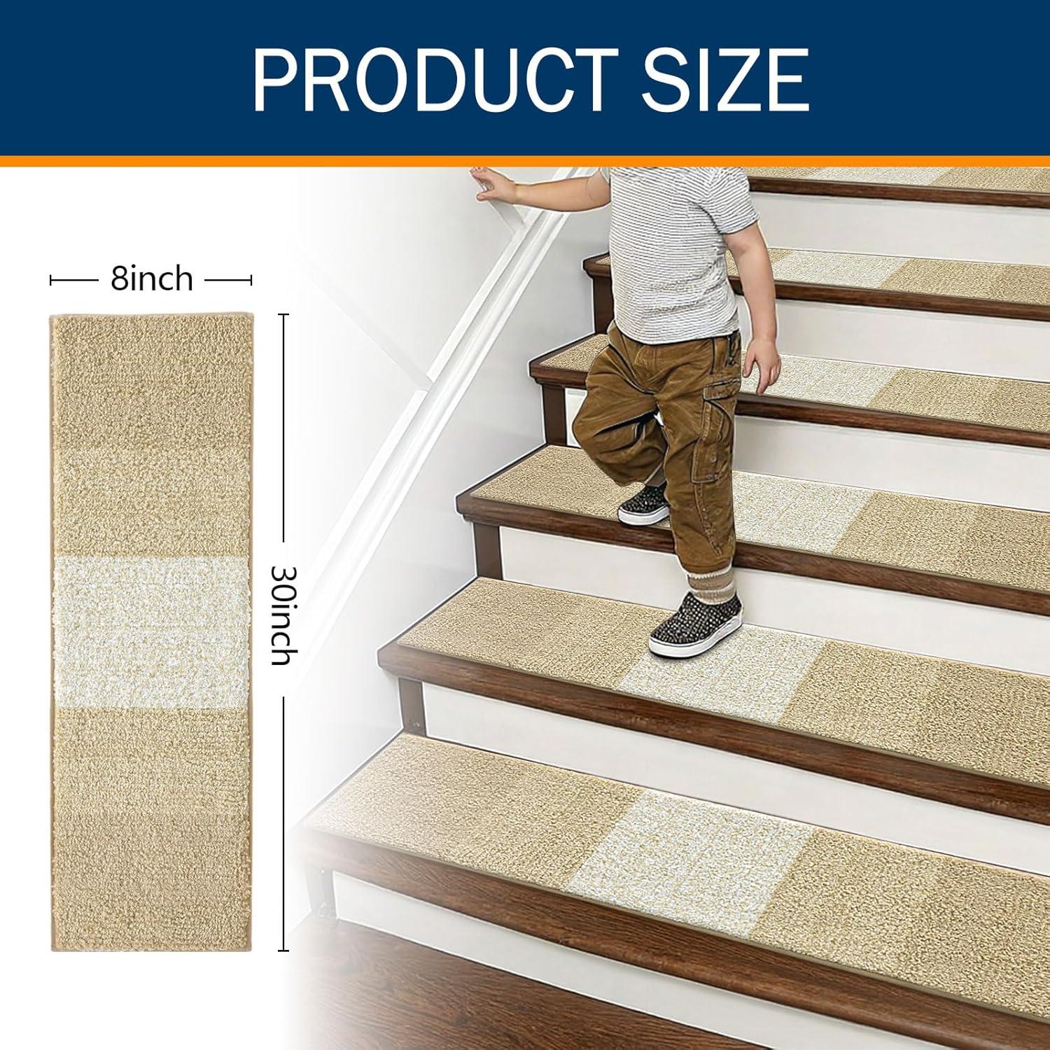 OLANLY Stair Treads Non Slip 15PCS, 8" x 30" Indoor Stair Runners for Wooden Steps, Edging Stair Rugs with Reusable Peel and Stick Adhesive for Kids Elders and Pets, Brown(Beige)
