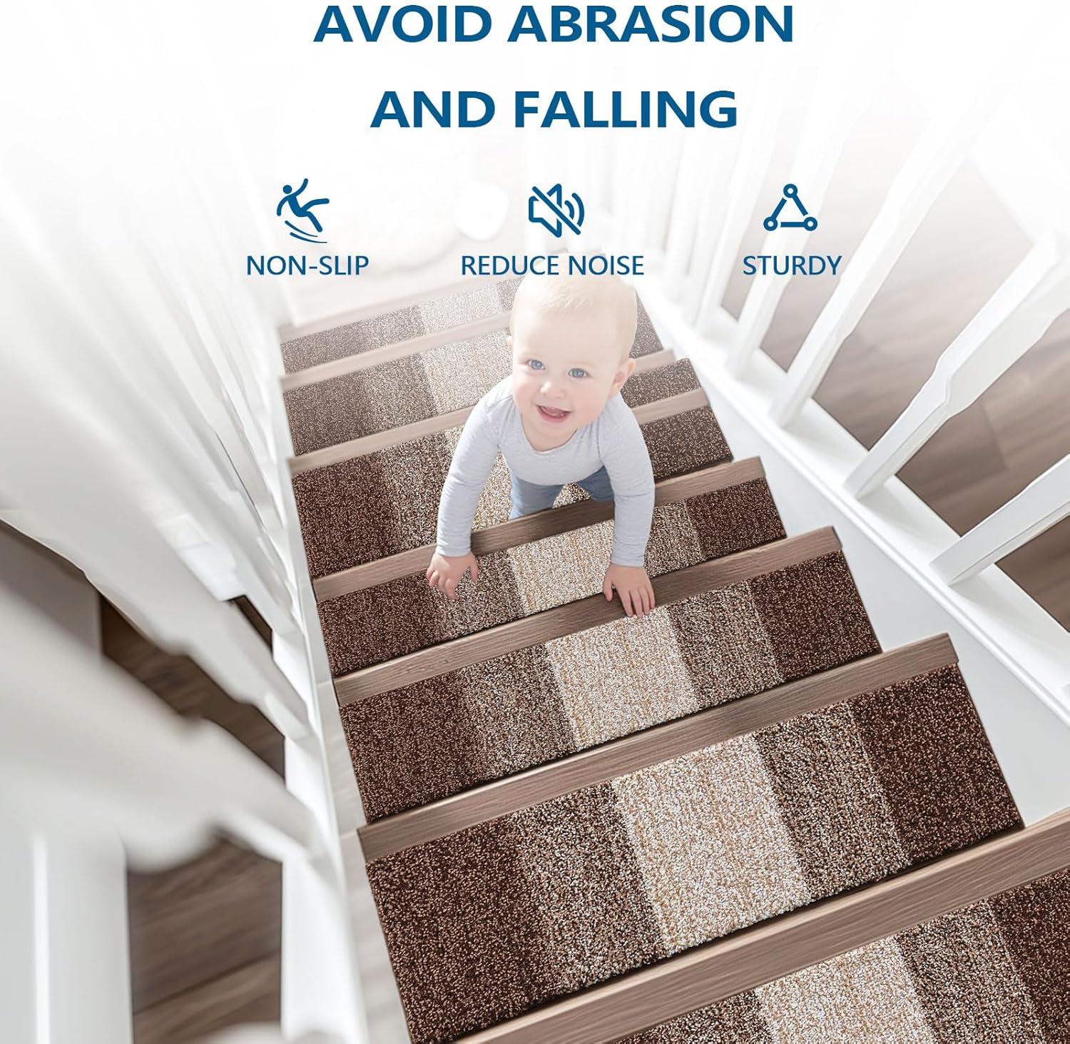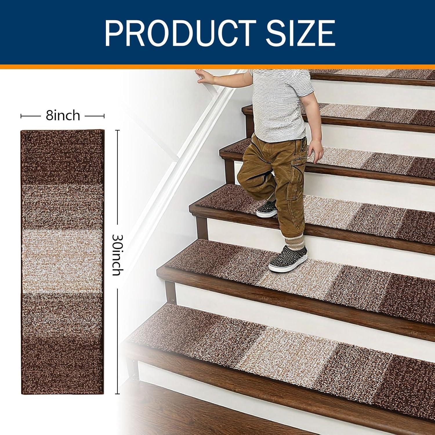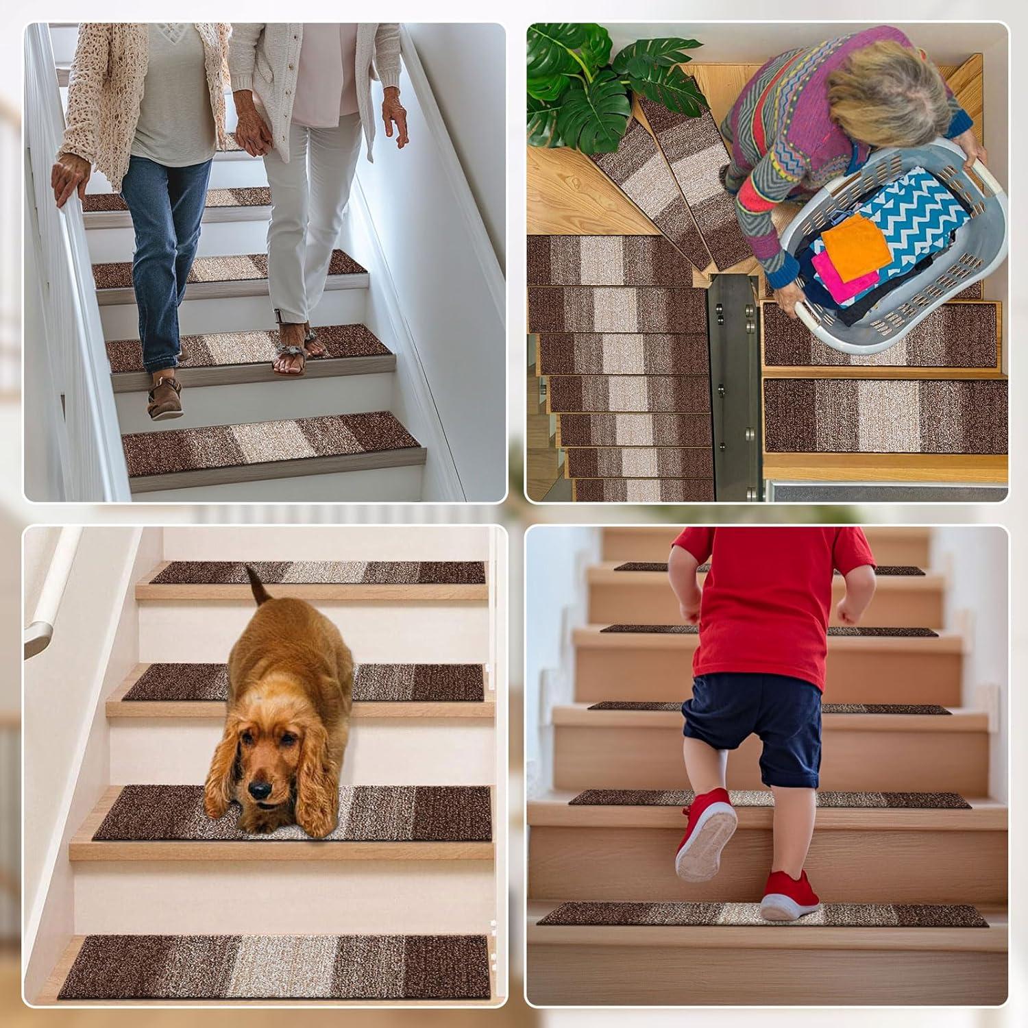 OLANLY Stair Treads Non Slip 15PCS, 8" x 30" Indoor Stair Runners for Wooden Steps, Edging Stair Rugs with Reusable Peel and Stick Adhesive for Kids Elders and Pets, Brown(Brown)
