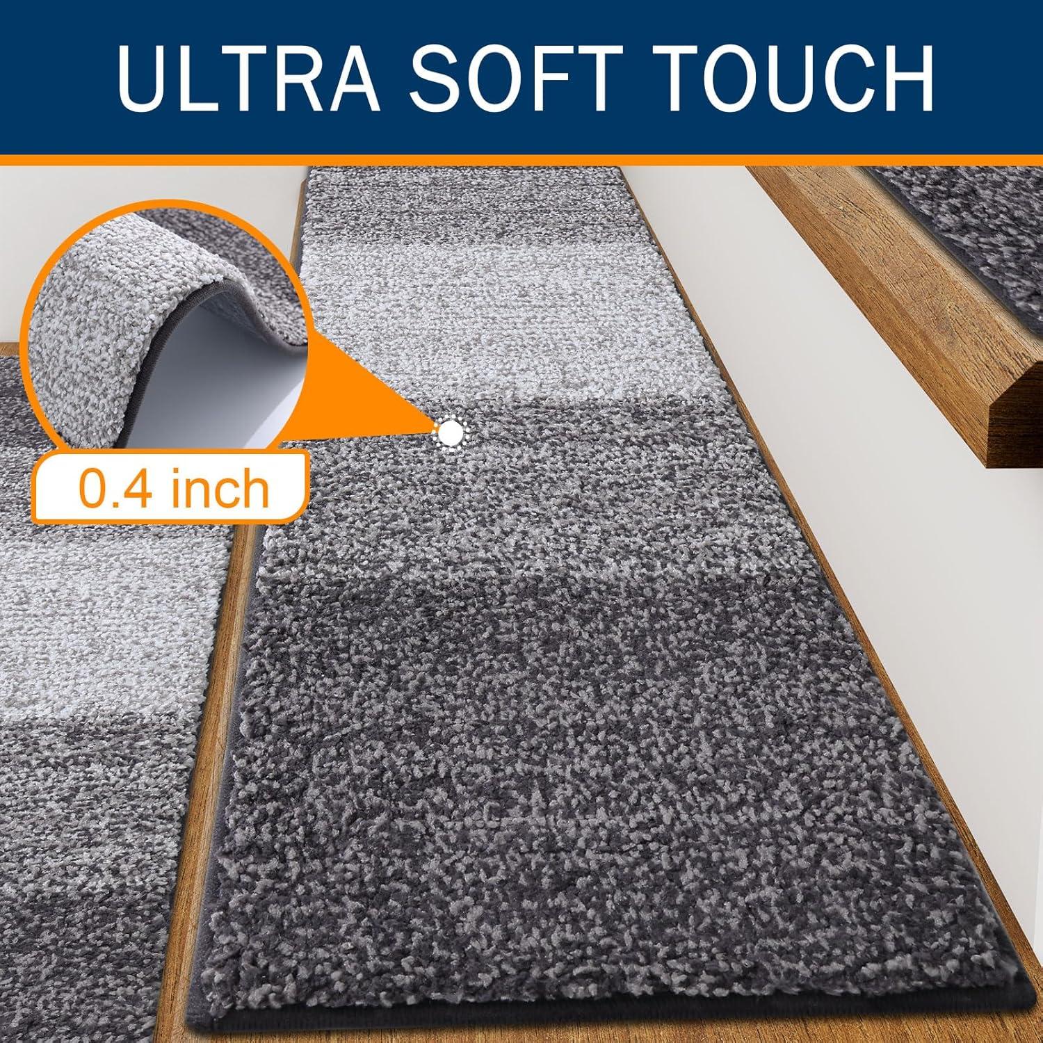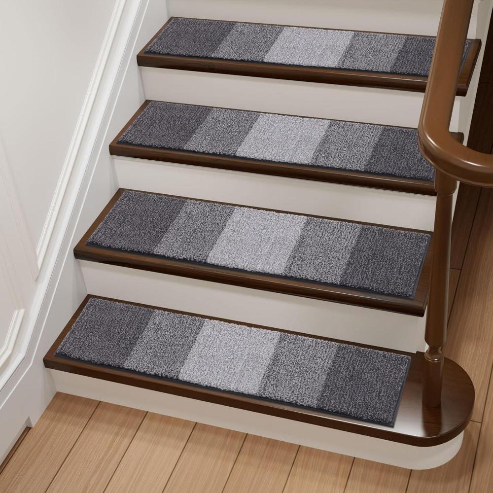 【Wide Use】The novel gradient color stripe design seamlessly blends stripes, creating an eye-catching pattern that adds sophistication to your space. The size of the stair tread is 8″ x 30″, and these carpet stair treads are applicable to any indoor smooth surface stairs such as hardwoods, tile, glass, marble, and etc