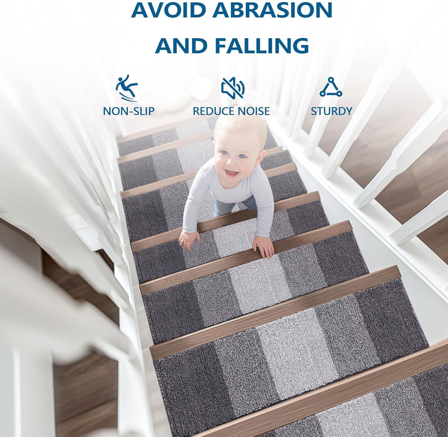 OLANLY Stair Treads Non Slip 15PCS, 8" x 30" Indoor Stair Runners for Wooden Steps, Edging Stair Rugs with Reusable Peel and Stick Adhesive for Kids Elders and Pets, Brown(Grey)