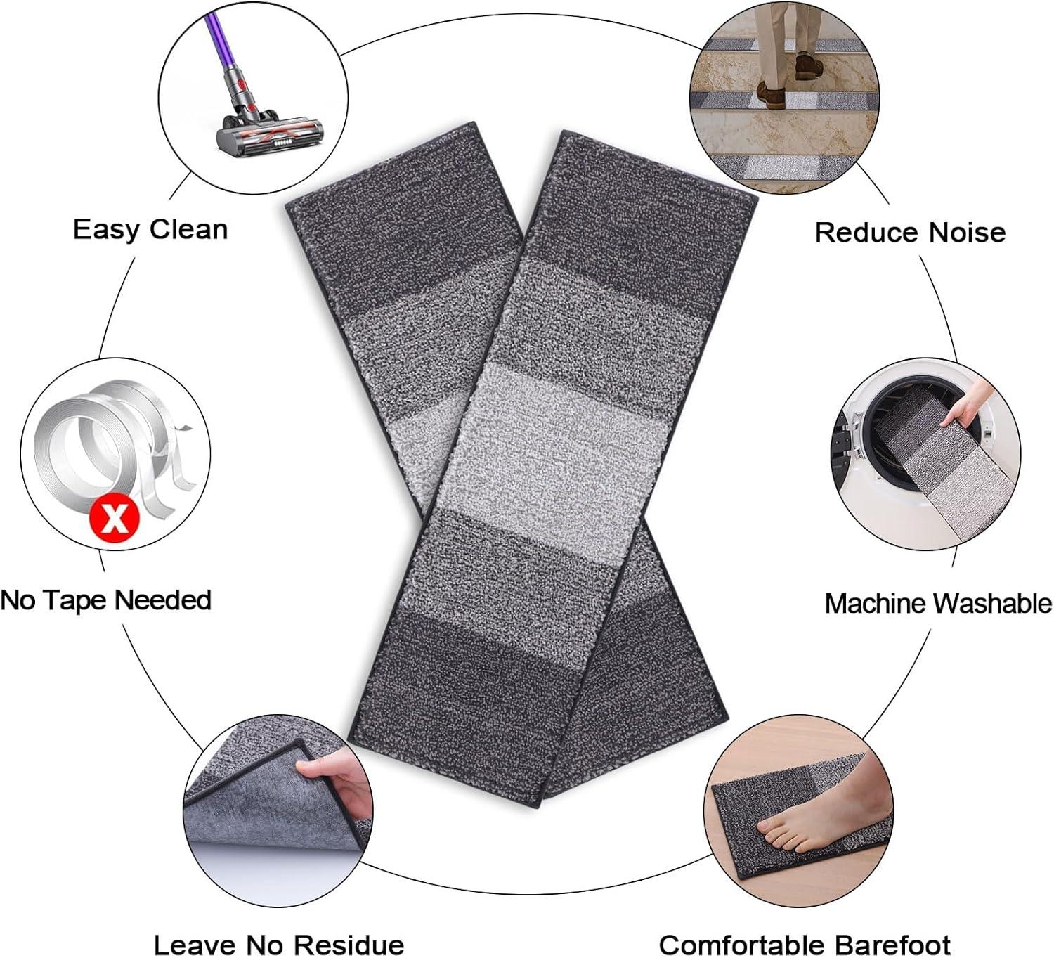 【Good Sticky and Anti-Skid Effect】Our non-slip stair treads feature a self-adhesive backing that safeguards your family from falling or slipping. The stair carpet treads have no sticky glue or tape, so you won't experience a strong stickiness upon touching. However, the stair runners for wooden steps can firmly adhere to your stairs after multiple tests. Sticky glue or tape may damage your stairs, but our staircase step treads will prevent this from happening