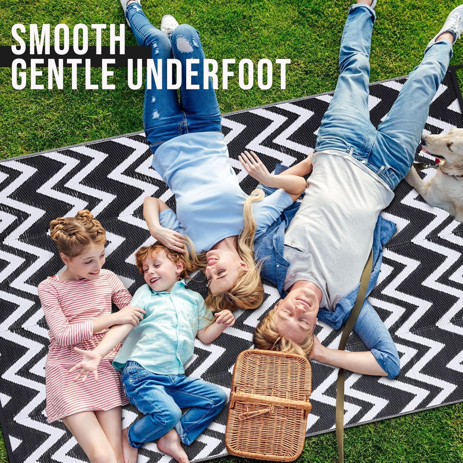 Stain-resistant & Easy-care: Crafted from recycled plastic straws, our camping rugs are waterproof, fast-drying, and built to handle anything. They're also a sustainable choice for your outdoor adventures, made from repurposed materials! Say goodbye to stains! Mud, grass, and spills simply rinse away with water, leaving your rug looking fresh and new.