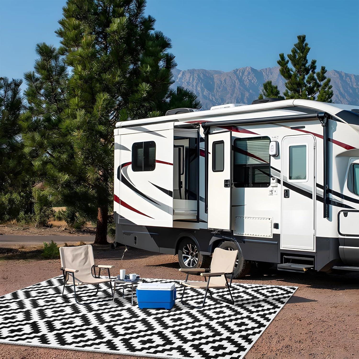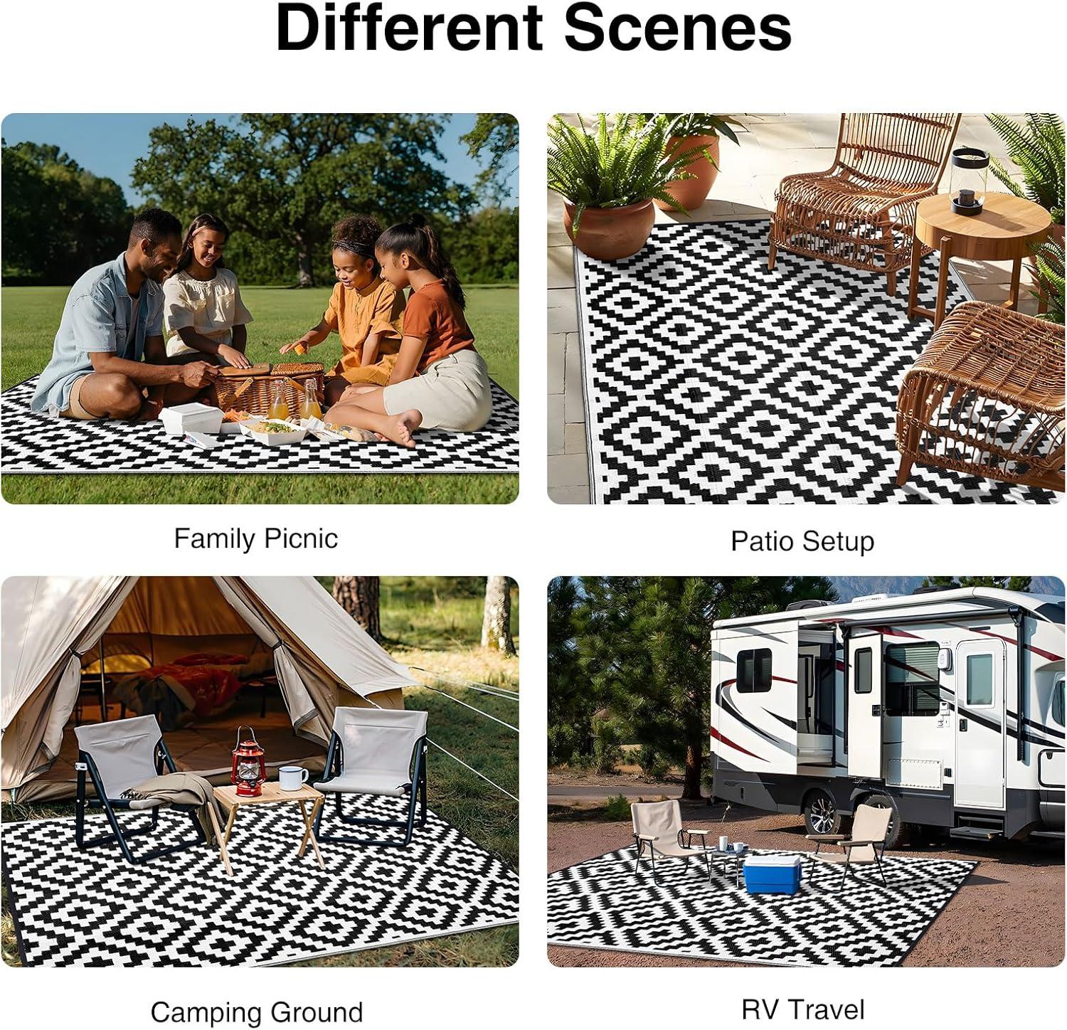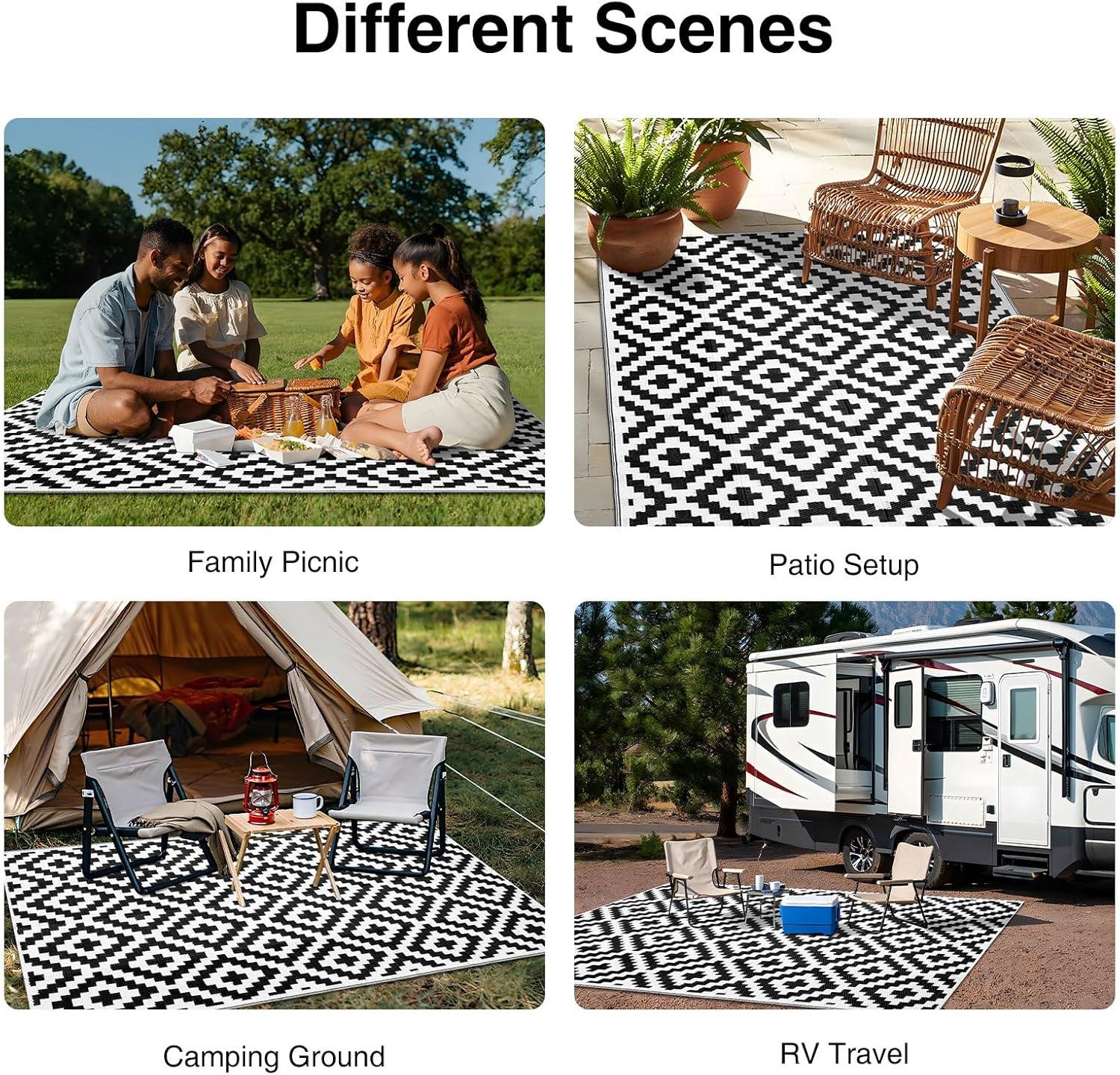 Stain-resistant & Easy-care: Crafted from recycled plastic straws, our camping rugs are waterproof, fast-drying, and built to handle anything. They're also a sustainable choice for your outdoor adventures, made from repurposed materials! Say goodbye to stains! Mud, grass, and spills simply rinse away with water, leaving your rug looking fresh and new.