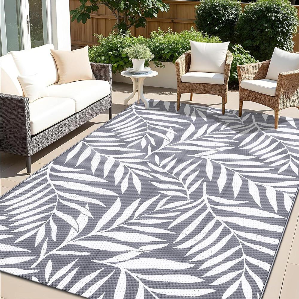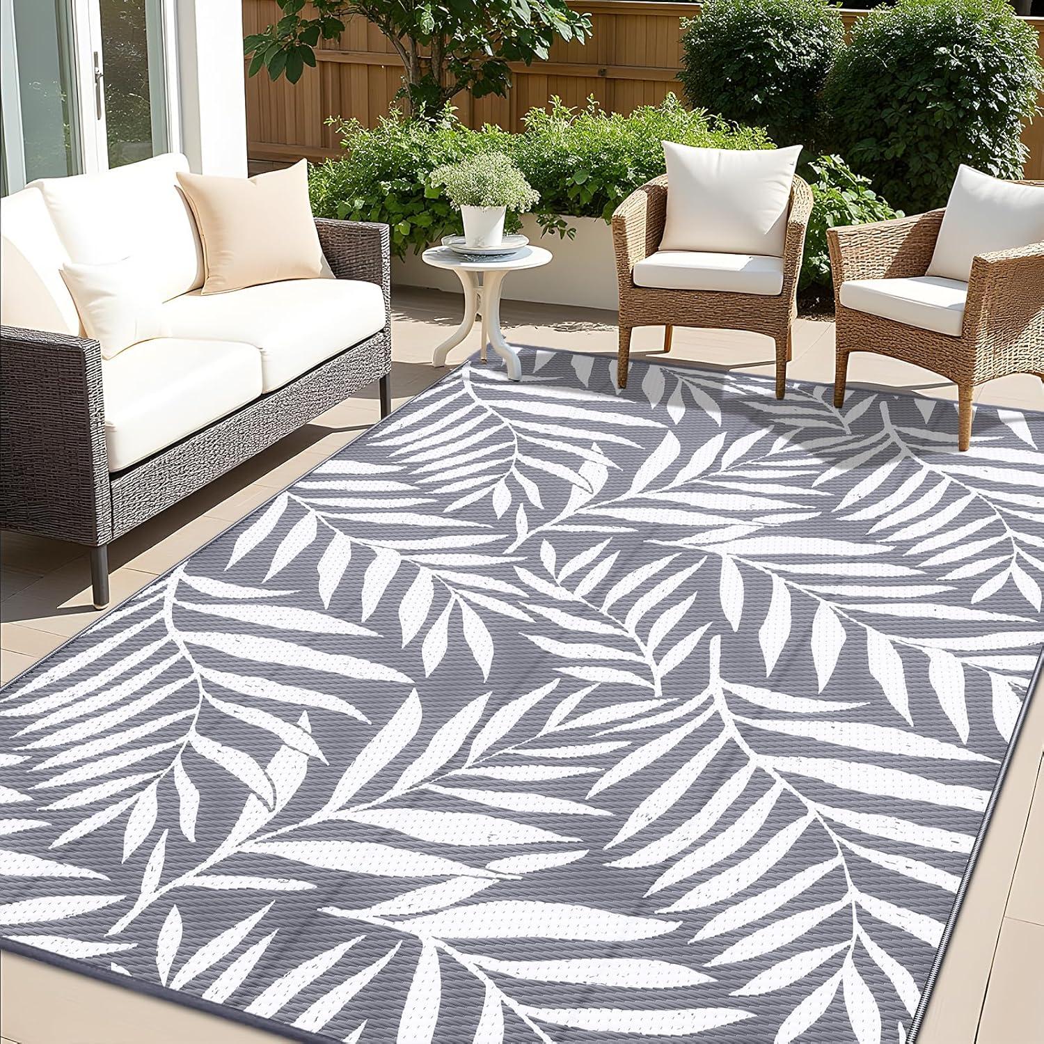 OLANLY Waterproof Outdoor Rug 5x8 ft, Reversible Outdoor Plastic Straw Rug with Leaf Pattern, RV Mat, Indoor Outdoor Carpet for Patio, Camping, Balcony, Deck, Backyard, Grey & White(Grey & White)